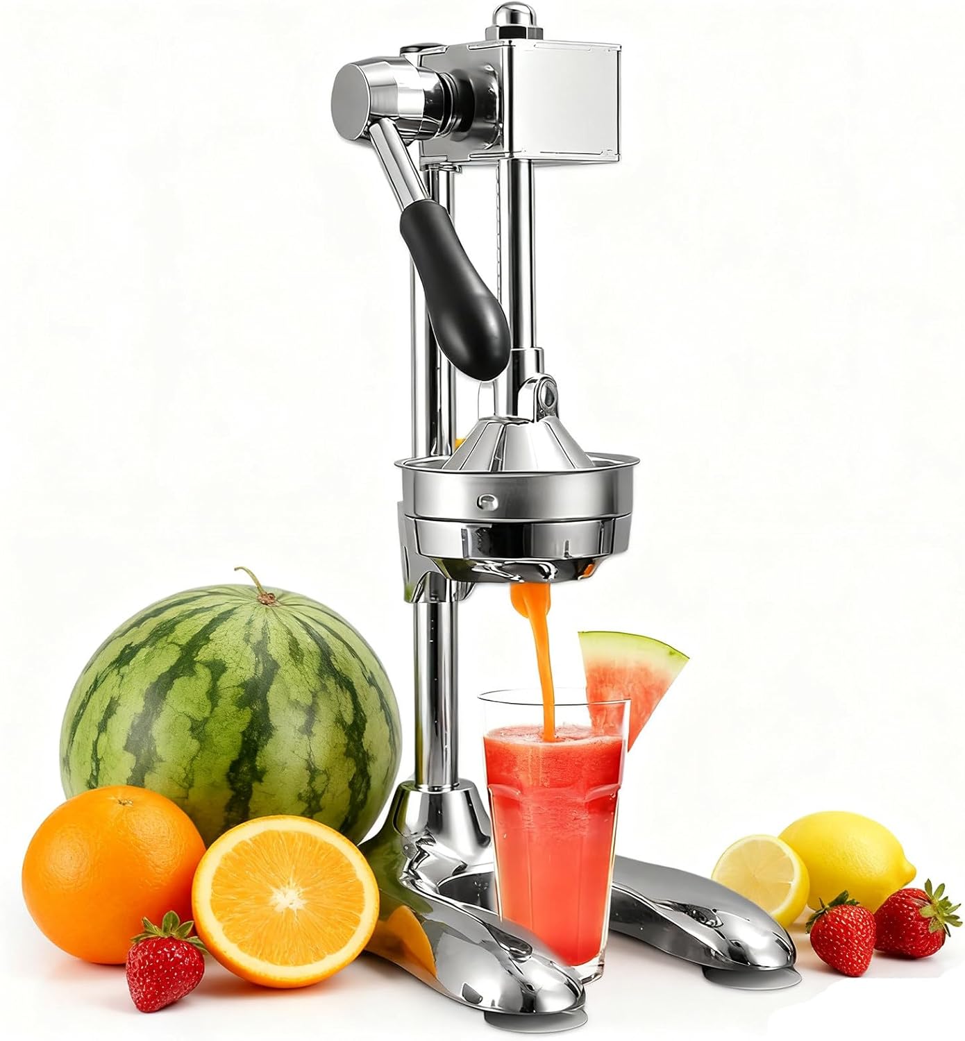 【Specifications】-Product Name: Manual Juicer-Color: White/Silver/Black/Orange-Material: 304 Stainless Steel + Aluminum Alloy-Jiusting Net Diameter: 120 mm-Base Thickness: 40 mm-Dimensions: 18 x 23 x 45 cm / 7 x 9 x 17.7 inches-Product weight: 3.2kg【Packaging Contents】1 x Juicer1 x Flat Juicing Mold1 x Pointed Juicing Grinder【Features】-Manual Juicing: Simply press and juice in 3 seconds, preserving the fruit's original flavor and nutrients. This increases efficiency by 60%. No electricity required, protecting the environment and saving energy.-High-quality Materials: Made of 304 stainless steel and aluminum alloy, it's durable and corrosion-resistant. Removable parts make cleaning easy and hygienic.-Sturdy Construction: The thickened base and U-shaped design ensure stability and prevent shaking during use, making it safer.-Suitable for a variety of fruits: Two molds are available for different types of fruits, such as lemons, oranges, grapefruits, and tangerines, making it a great choice for home and kitchen use.【Note】1. Due to environmental factors and photography, the actual product may differ in color.2. Due to manual measurement, there may be a 1-2 cm discrepancy. We appreciate your understanding.If you have any questions, please email us and we will respond within 24 hours.