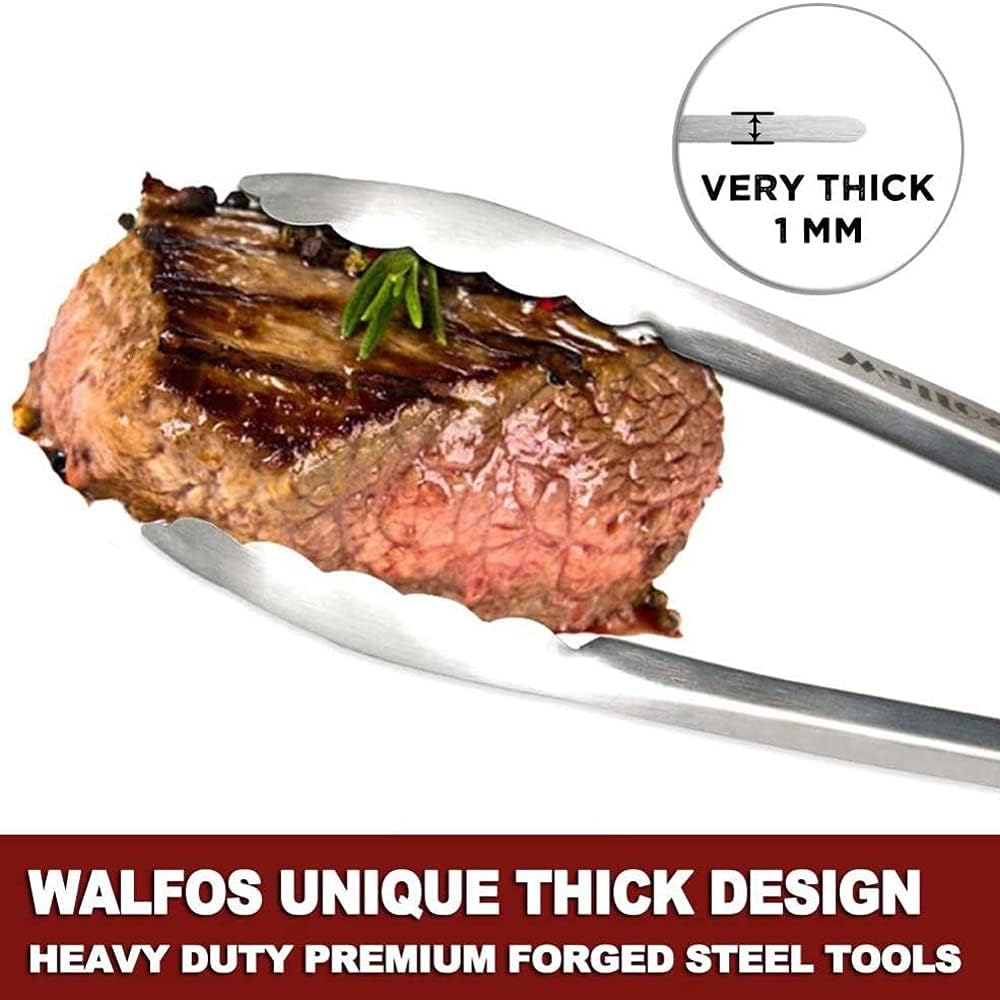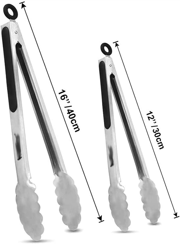 Size:12 inch,16 inchMaterial: Stainless steel & LOCKING DESIGN : Crafted for seasoned BBQ grillers with stainless steel and damage & heat resistant 。SAFE: Long enough to keep my hand out of the fire and the wood in the handle insulates the tongs even when warm.Extra long handles allows you to keep your hands cool while maintaining control. Silicone handle prevents heat from reaching your hands . COMFORTABLE: The sturdy and softy silicone handle makes this of the best grill tools available. This is a must have for your ultimate BBQ accessories set up. Easy to clean :These stainless kitchen tongs are rust-proof and prevent any juices or meats from sticking. Easily wipe off your barbecue tongs after use to keep them clean.FOOD GRADE MATERIAL: Metal BBQ Tongs are made from food grade stainless steel , NO Chenmical Coating.Safe to touch food directly, good for .Packing list :1x Food tongsNotes:The color of the item may be slightly different from the picture due to the difference in light and screen.Please allow a difference of 0.5-2 cm due to manual measurement.Silicone grip that helps you get the best grasp on your food, they also include an ergonomic thumb rest to help alleviate pressure on fingers and thumbs for additional comfort