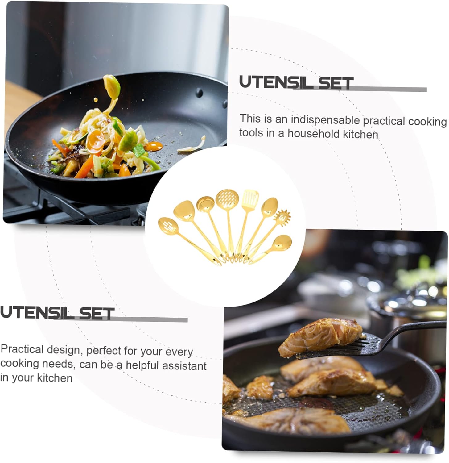 Package List 1 x Rice Scoop 1 x Slotted Turner 1 x Soup Spoon 1 x Noodle Spoon 2 x Slotted Spoons 1 x Turner 1 x Spoon Characteristics -Size soup spoon: 31x9cm12.20x3.54in stainless steel kitchen utensils -Color:Golden metal cooking utensils -Size slotted spoon 2: 36x11.5cm/14.17x4.53in stainless steel kitchenware -Size turner: 35x9.7cm/ 13.78x3.82in stainless steel cooking spoon -Size spoon: 36x7cm/14.17x2.76 stainless steel utensils -Size slotted spoon: 7.2x35.5cm/2.83x13.98in stainless steel kitchen tools -Material:Stainless steel kitchen utensils -Size rice scoop: 9x7.2cm/ 3.54x2.83in cooking utensil stainless steel. -Size slotted turner: 36.5x7.7/ 14.37x3.03in stainless cooking utensil -Size noodle spoon: 7.4x32cm2.91x12.60in stainless steel cooking utensils -The cooking utensils set is easy to maintain and dishwasher safe, also easy to clean stainless cooking utensils. -Featuring with a utility hanging hole at the end of the handle for convenient storage, smooth edges and comfortable to use stainless steel cooking utensil. -They crafted with ergonomic design, convenient and comfortable to hold and grip metal utensils.Goods Informationstainless steel cooking utensil Simple and elegant design makes them appropriate for dinner table and kitchen.stainless steel cooking utensils This utensil set is made of , and safe.kitchen accessories They will never cut your hands because of smooth surface.restaurant cooking tools They are non-stick, stain resistant, and heat-resistant, so they are easy to clean and healthy for your life