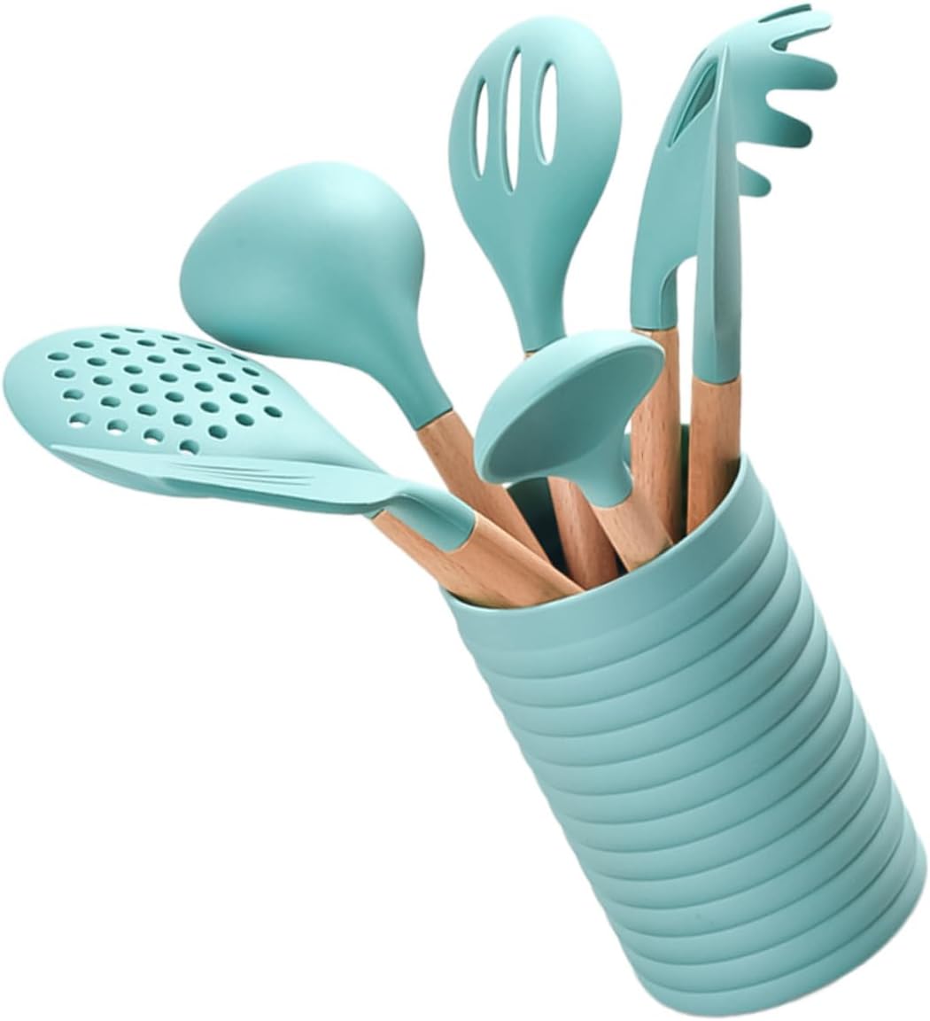 Package Include 14 ware, 1 x barrrel Features - Material: Wood and silicone creative kitchen supplies. - -blue household cookwareGoods Descriptioncooking shovels Our Kitchen Tools are heat resistant and safe to be used on a hot surface which makes them suitable in many usages including high- temperature frying,, stirring, flipping, mixing, blending, serving soup and so on