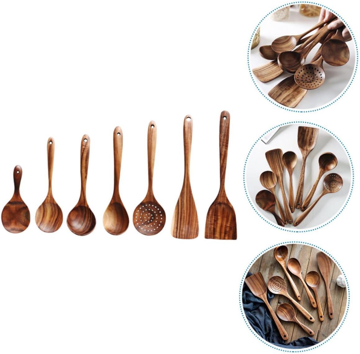 Package List 1 x cooking spatula 1 x frying spatula 1 x colander spoon 1 x large soup spoon 1 x small soup spoon 1 x mixing spoon 1 x rice spoon Features - Size: 18.00X7.50X1.00cm/7.07X2.95X0.39in(frying spatula) - Size: 26.00X7.00X2.00cm/10.22X2.75X0.79in(small soup spoon) -Product Info:Wooden spatula set - Size: 23.50X7.00X1.00cm/9.24X2.75X0.39in(colander spoon) -Material:Wood -Color:Assorted Color - Size: 25.50X6.50X2.00cm/10.02X2.55X0.79in(large soup spoon) - Size: 28.00X8.50X2.00cm/11.00X3.34X0.79in(mixing spoon) - Size: 33.50X8.50X1.00cm/13.17X3.34X0.39in(cooking spatula) - Size: 31.50X7.50X1.00cm/12.38X2.95X0.39in(rice spoon) -These spoons are very suitable for use in homes, coffee shops, tea houses, restaurants and other places spoon. -The smooth and ergonomic design of these utensils a comfortable grip, allowing you to cook with precision and ease household salt spoons. -Whether you're steaming vegetables or tossing a salad, these versatile utensils are up to the task and will help you achieve delicious results every time short handle wood spoon. -With a hanging hole at the end of every spoon, this set of cooking spoon can be easily the wall kitchen utensils wood.Goods Informationwood kitchen utensils Fine workmanship, smooth edges, easy to use, it can be used safely with confidence.Household Tea Scoops Safe to use.wood coffee scoop This wooden spoon.kitchen spoons for cooking The spoon is very suitable for bath salt, flour, rice, candy, applications.Kitchen Spice Spoons The smoothly polished edges will not your skin.practical tea scoops They are your good helpers in the kitchen