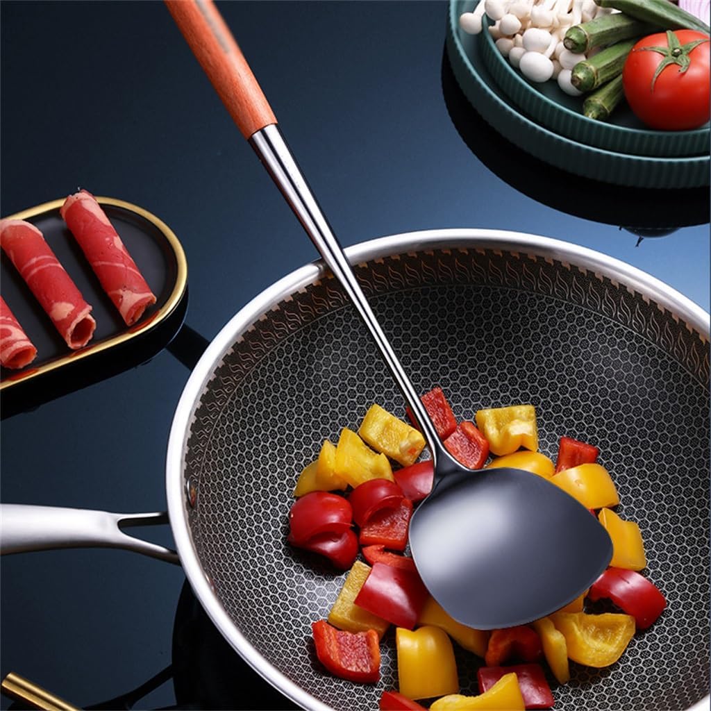 Better fit the bottom of the pot, more convenient for stir-fryingProvides a comfortable feel in the handSleek curves and rounded edges for easy scooping of soupThoughtful hook design saves spaceDeeper spoon to put more, thicker and more sturdyPacking list: 1 set (other demo products not included)Notes:Due to manual measurement, please allow 2-3 cm error.Due to different light, the actual color may be slightly different from the picture.High temperature resistant material, can withstand high temperature use, and has no odor when cooking
