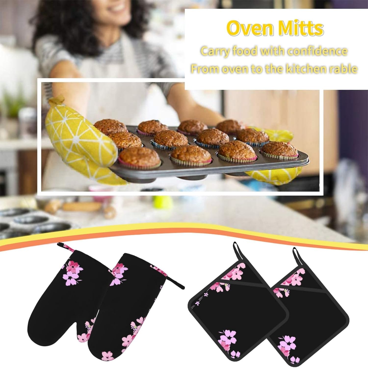 Upgrade your kitchen essentials with this oven mitts and pot holders set, designed for safe and comfortable handling of hot cookware. The set includes 2 heat-resistant oven mitts and 2 pot holders with pockets, making it a practical choice for daily cooking, baking, grilling, and microwave use.Crafted from high-quality polyester with thick insulated padding, these kitchen gloves deliver reliable heat protection up to 260°C. The soft quilted lining ensures comfort and flexibility, while the silicone palm design enhances grip and control when handling hot pots, pans, and trays.The non-slip silicone surface provides added stability, giving you confidence when moving hot cookware. Waterproof inner and outer layers make cleaning simple—just wipe clean or hand wash and air dry for easy care.Each piece features a convenient hanging loop for organized storage and quick access in your kitchen. Stylish and functional, this oven mitts set also makes a thoughtful gift for family and friends on holidays, housewarmings, and special occasions.