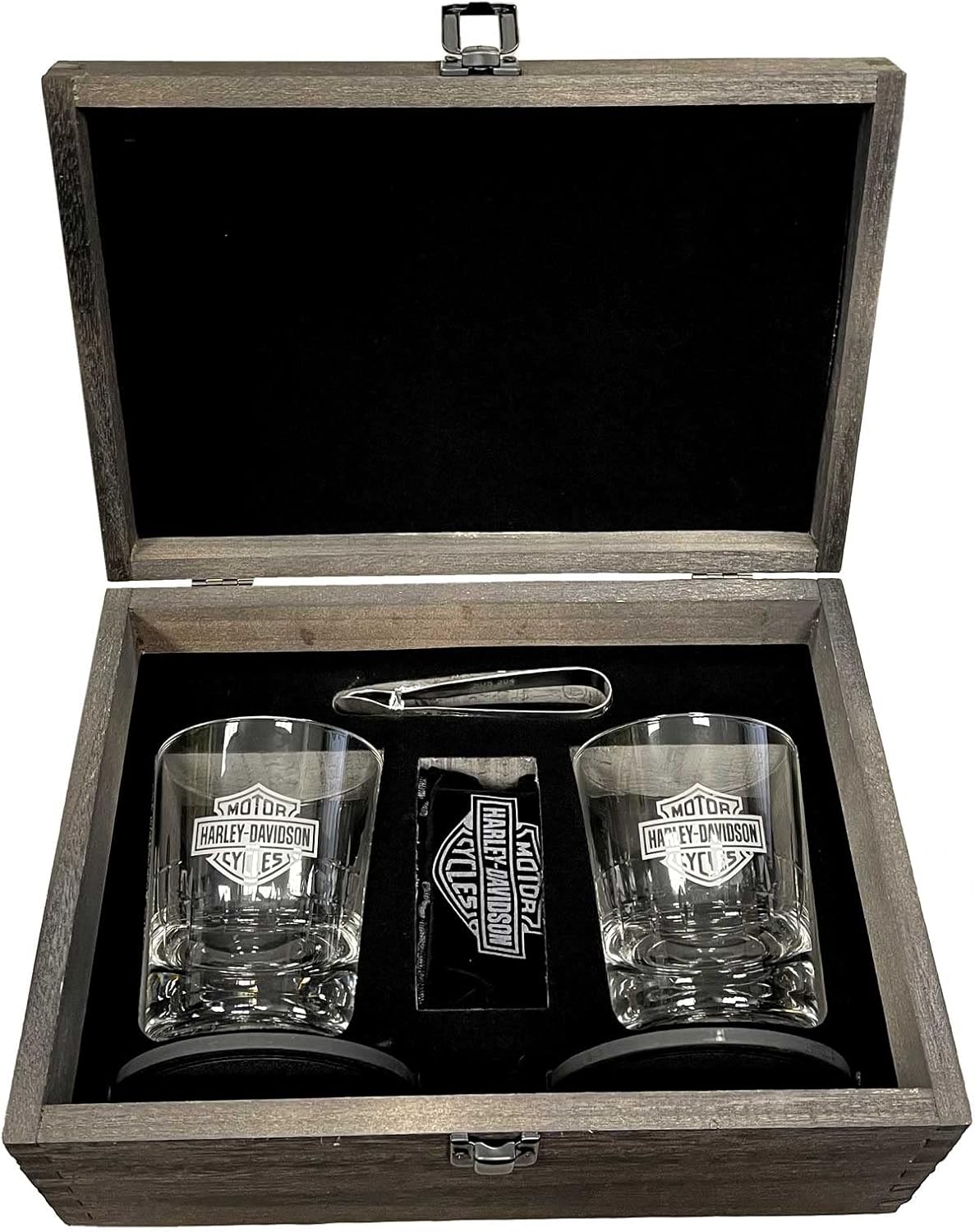 | Included Components | Harley-Davidson Bar & Shield Logo Premium Whiskey Glass Wooden Box Gift Set |