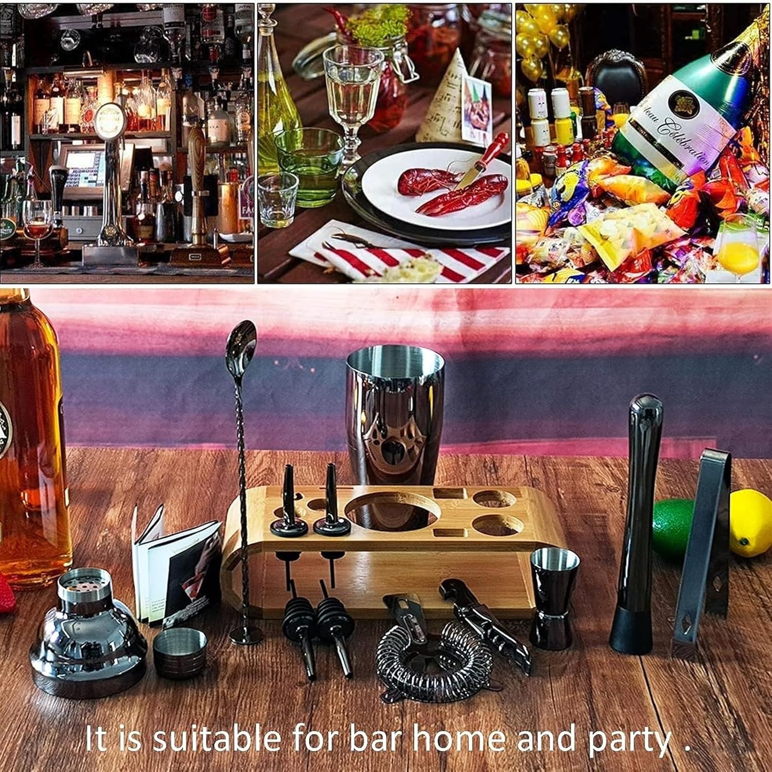 Pro Cocktail Shaker Set with Display Stand The 12-piece cocktail making set offers the complete basic accessories you need to make your favorite mixed drinks. Even beginners can make the perfect cocktail just like a professional bartender. Product Features: - High quality stainless steel: rust-proof and smooth - Surface: Finely polished to prevent rust - Easy Storage: Bamboo stand -Dishwasher safe components; easy to clean - Complete Component: Set of 12 - Perfect mixing kit for home and bar Maintenance Tips: Clean the stainless steel utensils with water before use, then wash with boiling water several times and sterilize at high temperatures. Stainless steel dish should be cleaned with a soft cloth and warm water and diluted detergent. Do not use alkaline bleach, metal cloth, chemical rag etc. Prevents odors and stains, and if used for long term cleaning, please clean and dry well. Package Includes: 1 x Cocktail Shaker 750ml 1 x Double Jigger 1 x Ice Tongs 1 x Strainer 4 x Liquor Pourers 1 x Muddler 1 x Spoon 1 x Wine Opener 1 x Bamboo Stand 1 x Cocktail Recipe We hope you have a professional and easy to use cocktail shaker set soon. It will be the icing cake for your wonderful life!