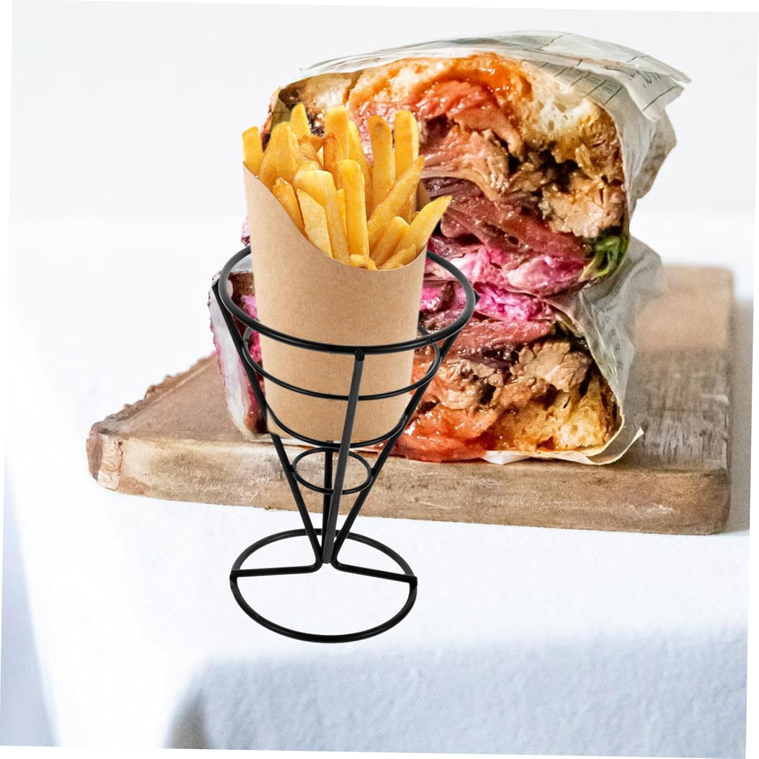 Package List 8 x French Fries Holders Features -Color:Assorted Color Fries Chips Basket -Size:14.50X10.00X10.00cm/5.70X3.93X3.93in Fries Holder -Material:Iron Snack Stands - The creative construction design of this french fries holder can well store and display your food Fried Chicken Stand. - Compact in size, not take up much space, you can simply put this french fries cone holder at any place you want Snack Holders. - Great for a variety of foods fries, chips, onion rings, meet your requirements very well Fries Basket. - Holds French fries in such a stylish french fries holder, for many occasions like wedding, banquet, birthday, etc French Fries Cone Basket. - Adoption of iron material, this snack display holder is and support to use for a long term Appetizer Serving Racks.Goods InformationRestaurant Tableware This iron french fries basket is made from iron material, resist to or corrosion, to deform, which can well serve you for a long period.French Fries Baskets to hold chips, snacks, french fries, fried chicken, appetizers and more food, fit your demands