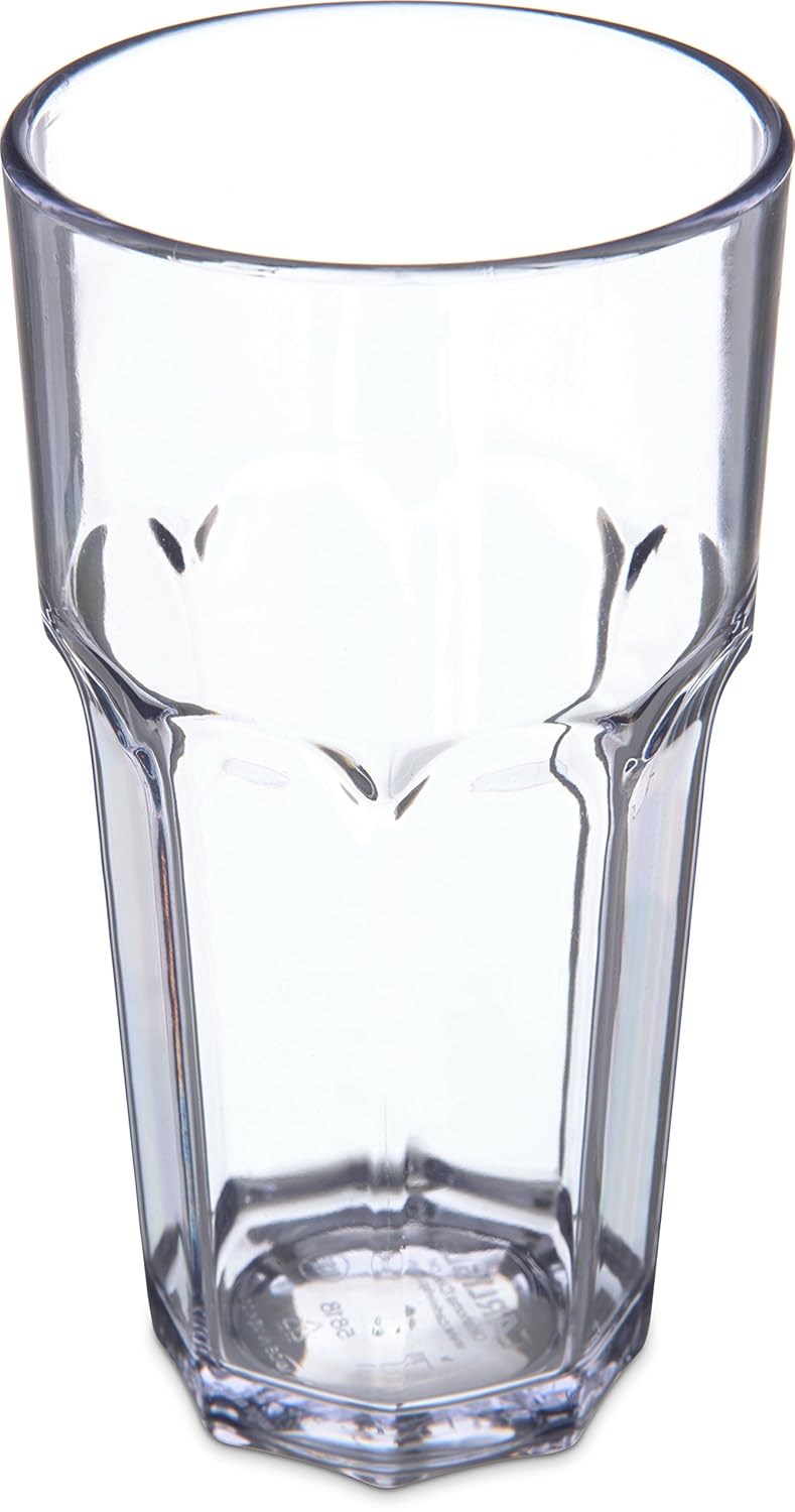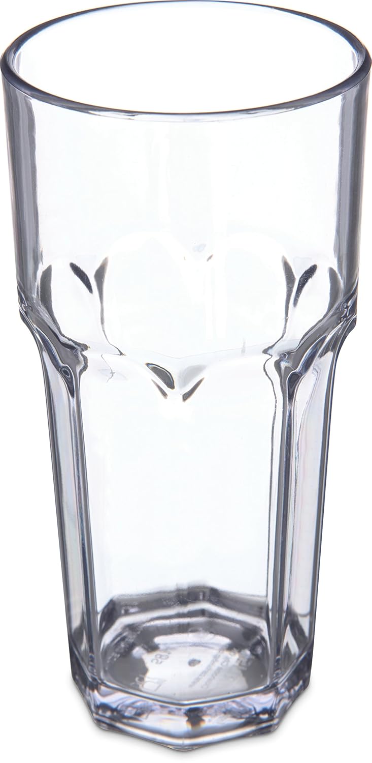Elevate your dining experience with this pack of 24 Carlisle FoodService Products Louis Clear Tumbler Glasses. Whether you're running a restaurant, catering an event, or managing a bustling kitchen, this 20-ounce plastic gem is the secret ingredient to take your service to the next level. Designed for comfort, the faceted shape of this tumbler ensures a secure and pleasant grip. Say goodbye to those clumsy accidents and enjoy a smooth dining experience where every sip is a delight. Revel in the elegance of glass without the constant fear of breakage. This plastic tumbler is a master of illusion, flawlessly mimicking the appearance of glassware, adding a touch of sophistication to any dining setting. Your guests will appreciate the attention to detail. Crafted from robust SAN (Styrene Acrylonitrile), this glass is your steadfast companion, ready to face the challenges of restaurants, catering, and kitchen environments. It offers peace of mind against breakage, ensuring your investment stands the test of time. Efficiency meets elegance with these glasses. Designed for space-saving, they stack easily, keeping your storage area neat and organized while preserving their immaculate appearance. SAN doesn't just shine in terms of break resistance. It's a pro at withstanding stains, breakage, and chipping, making these short plastic tumblers a breeze to care for. And the eco-conscious crowd will appreciate that they are NSF Listed, dishwasher safe, BPA free, and recyclable, making them an eco-friendly choice for your food service needs.