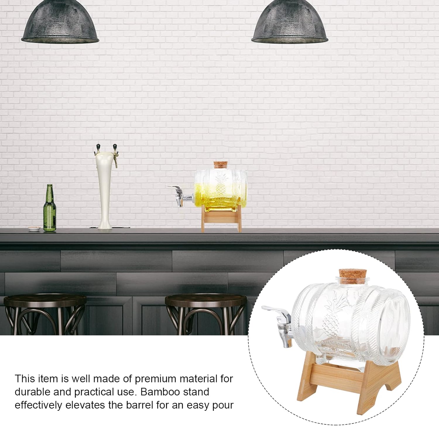 Description This beverage barrel is made from . It with retro appearance design, can add special charm to your parties and home. It is for all kinds of beverage, like coffee, milk tea, beer, fruit juice and alike. Features- Color: As shown,- Material: Glass+ bamboo+ stainless steel,- Size: About 20. 50X19. 00X 14. 00cm/ 8. 06X 7. 47X5. 50in,- Glass material, transparent, allowing you to watch the remaining wine or juice amount in the barrel.- Can produce juice, fruit wine, bayberry wine, wine and so on.- With faucet, it is more convenient to use.- With a sealing lid, it can be used to brew wine. - Featured with an environmental friendly bamboo rack, the barrel can remain in a stable position. Package Including 1x set of wine bucket