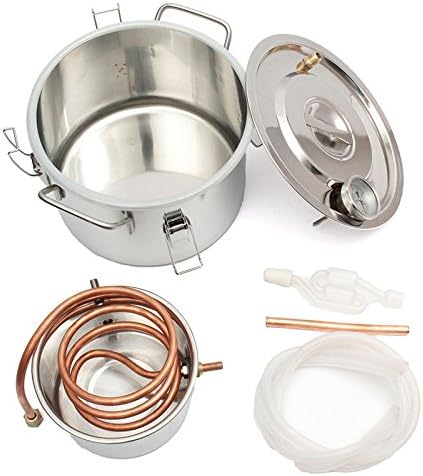 Description: Material:Stainless Steel Model Number:Making Wine accessories Feature:Eco-Friendly Type:Bar Accessories Bar Accessories Type:Making Wine accessories This product is fabricated from pure stainless steel. The design incorporates an independent airway to allow the distillate to rise faster and delivery a higher purity. This is a sophisticated and versatile piece of equipment. This multifunctional equipment can be used for: distilling fruit wine, distilling water, purifying water, distilling brandy, and refining plant extracts for medicinal purposes. The construction is all Stainless steel which has been argon welded thus avoiding any of the health problems associated with copper and solder constructed stills. Size: The boiler dimension are 27 cm diameter, boiler height 20 cm It is use copper pipe make the cooling coil (worm) Package list: 1.Stainless steel boiler with thermometer 2.Copper cooler with stainless steel cup and copper pipe 3.Water hose with water inlet connect your house tap 4.Air vent valve use for ferment 5.Print instructions (it included how to make moonshine and recipes) 6.Copper column NOTE: The bottom of the barrel is welded, so it will leave welded material, so you should dry the equipment with dry clean cloth every time after you used the product, or it will be rusty; if you forget to dry the equipment, and the equipment has been rusty, you can use deruster or acetum and salt to derust
