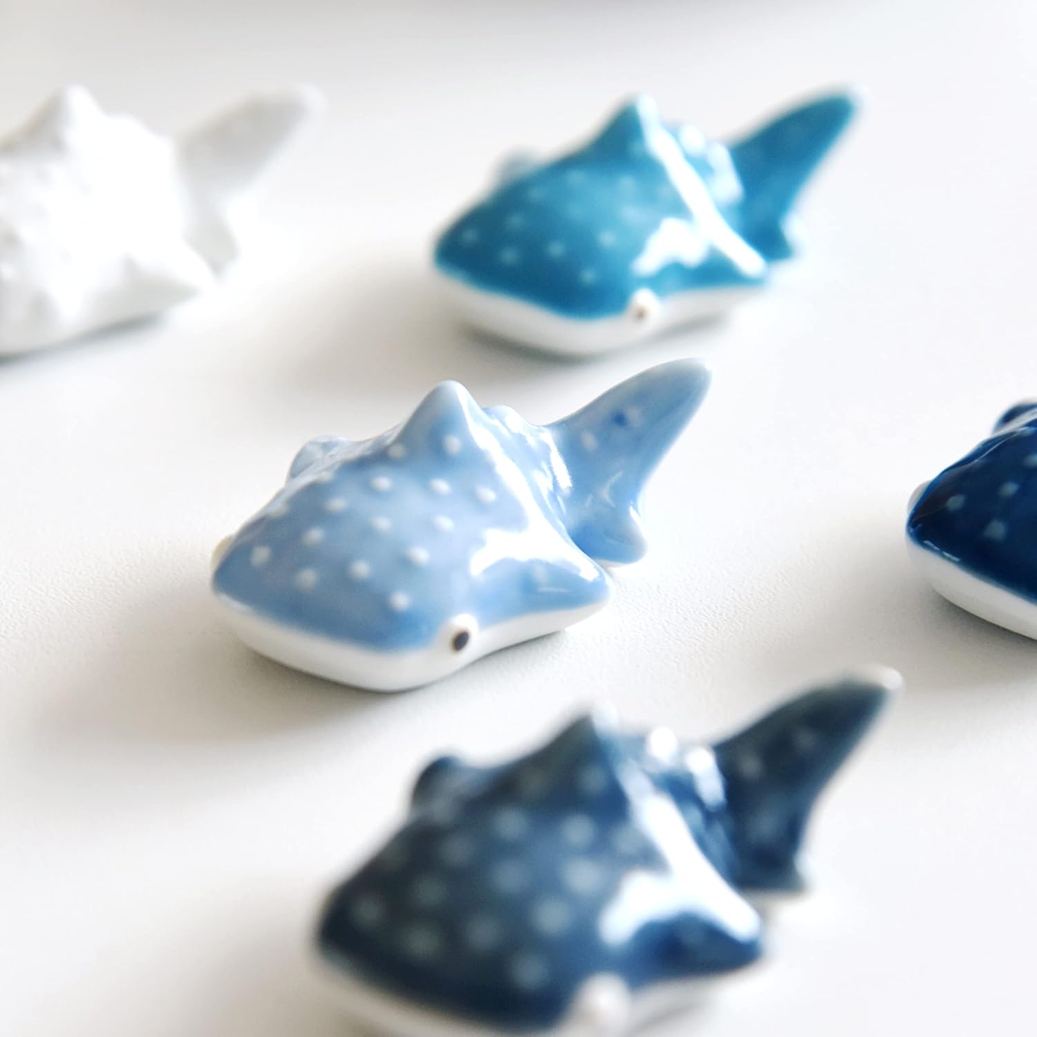 What is Hasami Ware Porcelain from the Edo era was a very high quality product and was meant for limited people. Hasami Ware is made in mass production for the masses. By producing large quantities, it is a good place to make good quality and reasonable daily dinnerware. While we think that the importance of everyday dinnerware is the price, ease of use and durability, it is said that it is a combination of production. Shark, Whale Shark The popular image of the cocomarine series gimbu sharks. This is a 3D version of this popular character. I tried to make a ladder. We use molds to create shapes for mass production, but first we introduce our attention to the mold. 1. Curved fins for a shark feel and sharp. 2. Shows a swinging tail to the left to feel the movement. 3. In order to create a cute and unique pattern of the shark whimsical, we have also paid attention to the size of the dots. We introduce our commitment to the finish after the mold is made into the mold. 1. Hand shaped to produce fins sharpness. 2. Carefully finishing is required to avoid the pattern being removed from the mold, such as the eyes, dots, and mouth. 3. The 4 colors of the blue color are water repellent, so that the color glaze and white parts are two colors. 4. 4 blue colors are hand-painted eyes. Finally, by using the molds well and using careful handwork by artisans. A whimbale shark bookmark with attention to detail.