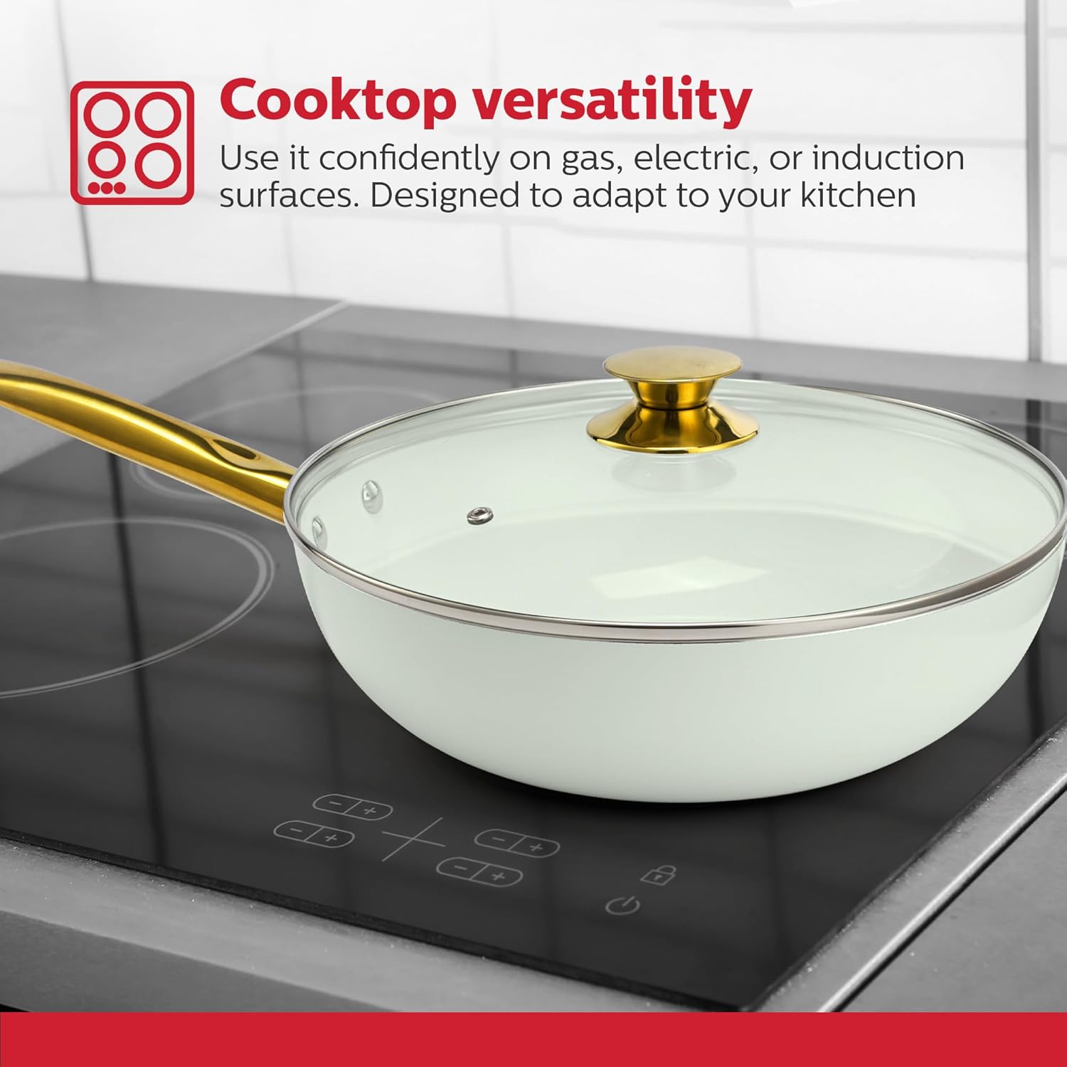 Holstein Housewares 12-inch Ceramic Wok is a must for any kitchen! The handy cookware is ideal for many types of cooking - Braise, sear, fry and sauté delicious recipes at home with one pan. Its 12-inch non-stick white ceramic surface makes cleaning easy and quick. It features a gold stainless-steel handle for a comfortable grip and a tempered glass lid for visibility while cooking. Get the most out of family meals with this handy wok!