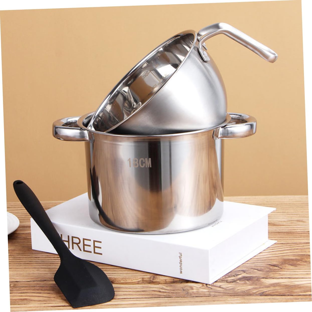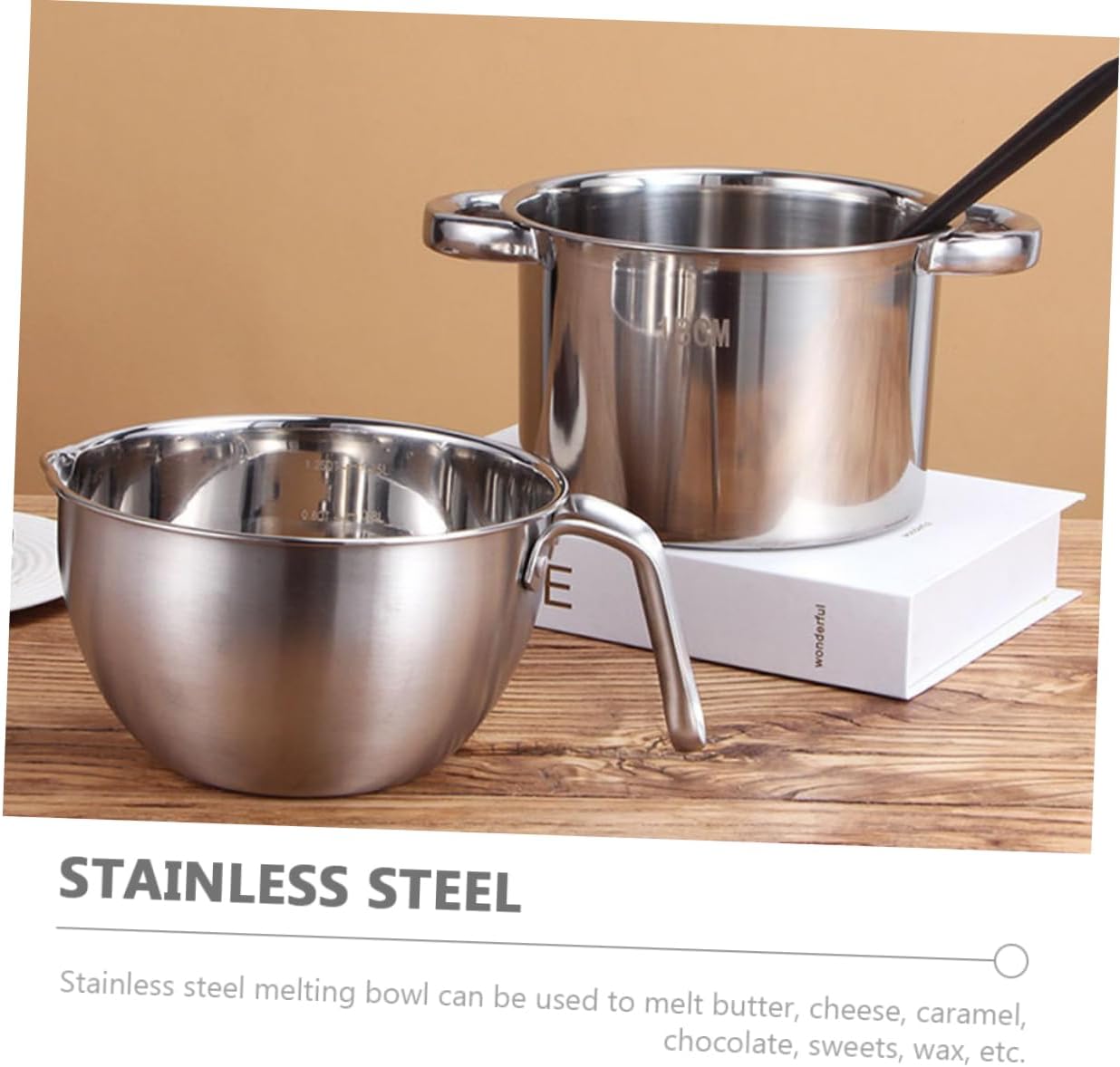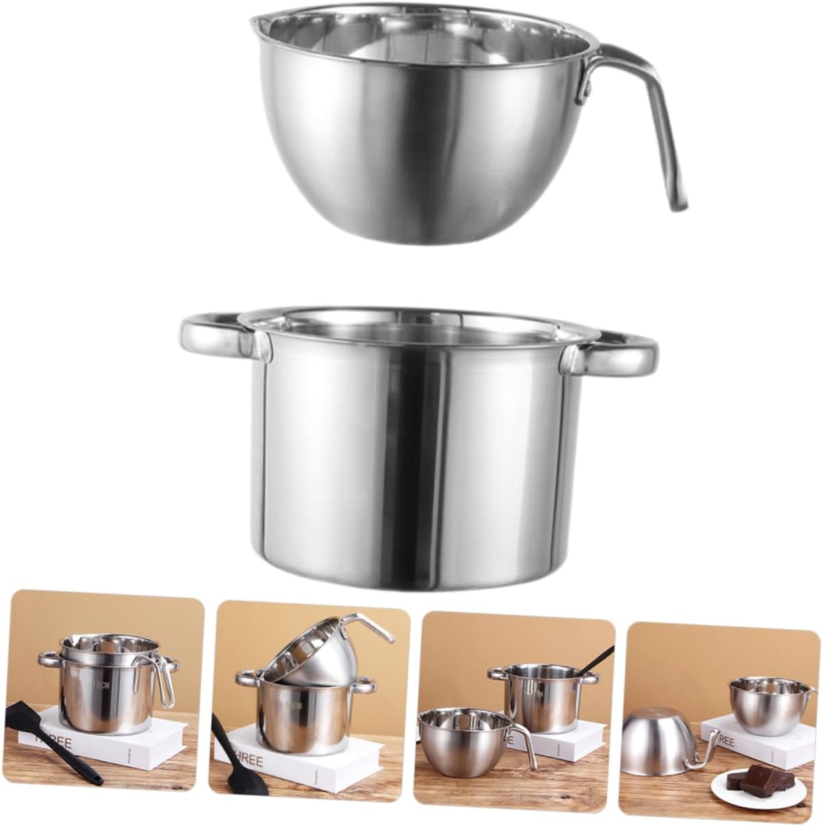 Package Include 1 x outer pot 1 x interior pot Features -Size:16.00X9.70X9.00cm/6.29X3.81X3.54in(interior pot) Chocolate Melting Pot -Color:Silver Stainless Steel Double Boiler -Size:18.00X18.00X11.50cm/7.07X7.07X4.52in(outer pot) restaurant pots -Material:Stainless steel double boiler pots pan - A perfect heating and melting pot. Melting Bowl is suitable for home, bakeries, cake shops, restaurants, etc double boiler stainless steel. - Stainless steel melting bowl is perfect for cheese, butter, candy, chocolate, candle, caramel, etc chocolate melting pot for dipping. - The melting pots are adopted with Stainless Steel material, sturdy and for long-term use pot with pour spout. - Fine workmanship and creative appearance their popularity and practicality. Not easy to break and deform. Cheese Melting Pot - This melting pot is the great present for friends and relatives who like baking and cooking chocolate warmer.Goods InformationStainless Steel Double Boiler Made of stainless steel materials, and .Kitchen Supplies Are you looking for and convenient melting pot? If your answer is yes, please come and take at the melting pot! Our professional melting pot must meet your needs.mixing bowl for chocolate melting The melting pot is your