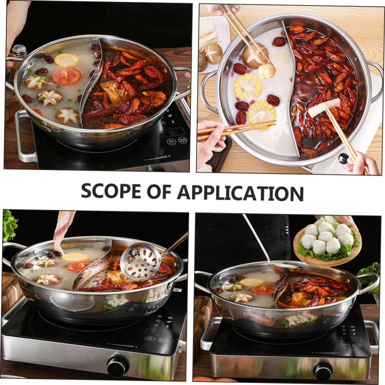 Package List 1 x pot 2 x colander 1 x spoon Characteristics - Size: About 32.00X32.00X9.50cm/12.58X12.58X3.73inch(pot); 27cm/10.63inch(colander, spoon). Kitchen Supply - Material: Stainless steel Stainless Steel Hot Pot. - Color: Silver Two-flavor Hot Pot. - It is and lightweight, easy to clean without hurting your hands Stainless Steel Pot. - The material is and , which is wear resistance and for the long time use Kitchen Cooking Pot. - With this pot, you can make some delicious hot pot food, a helper for life Hot Pot Colander. - The anti-scalding handle is convenient to hold and prevents burns Kitchen Stainless Steel Stockpot. - It can solve the problem of heavy mouth and difficult to adjust, divided into compartment, and taste the taste you like Hot Pot Spoon.Goods InformationHousehold Hot Pot It is suitable for family or friends gathering.Soup Cooking Pot The two-compartment design allows you to cook different flavors of hot pot according to your own preferences.Kitchen Cooking Pot This product is a hot pot container, made of stainless steel materials, and