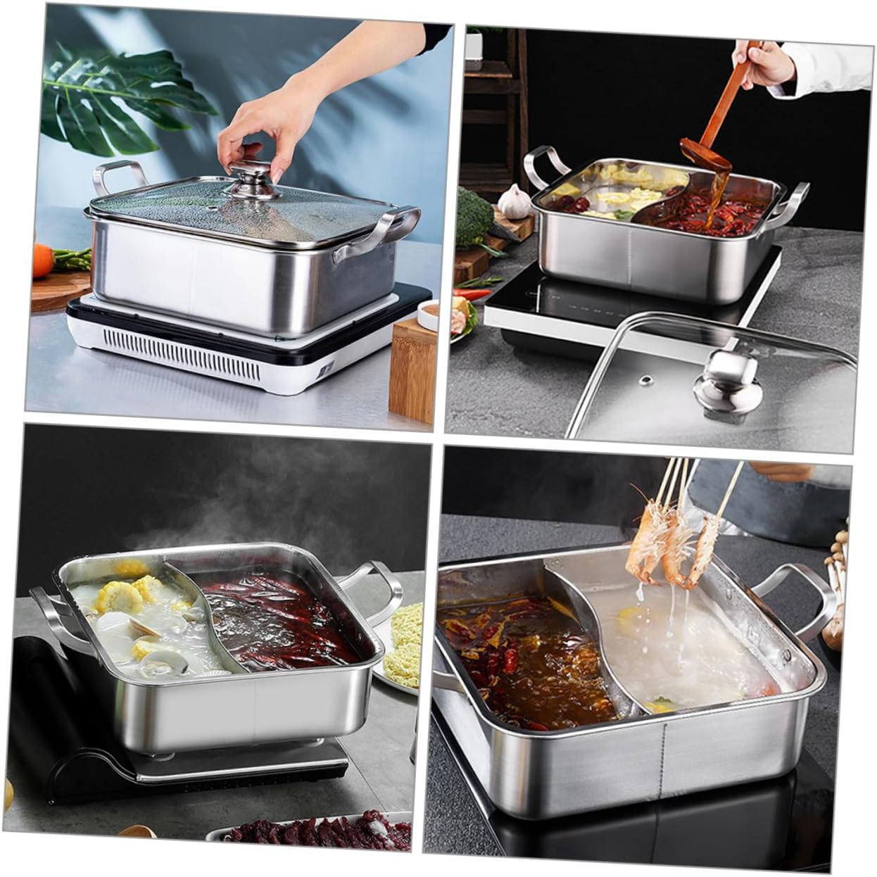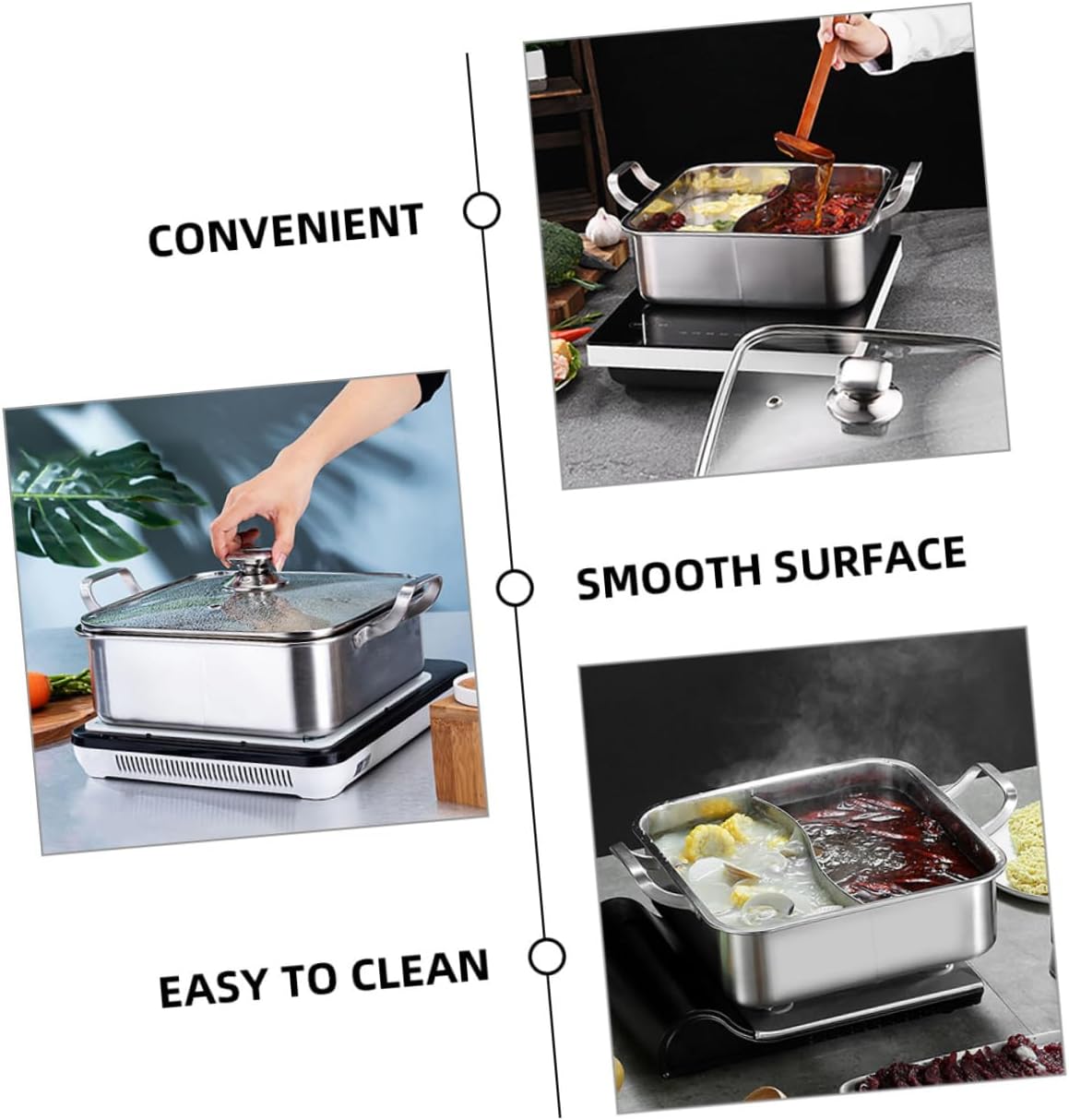 Package List 1 x cooking pot Characteristics -Material:Stainless steel, glass hotpot pot with divider -Color:Silver two-flavor hot pot -Size:26.00X26.00X9.00cm/10.22X10.22X3.54in hot pot - The compartment design allows you to cook hot pot of different flavors, can meet different taste at the same time stainless steel cooking pot. - This hot pot is for commercial and home use, allowing multiple people to enjoy the dining experience divider pan. - Manufactured with stainless steel, glass material, the pot is and enough to use restaurant soup pot. - The Hot Pot is suitable for induction, stoves, gas, cooktop, Hot Pot is easy to use chinese style hot pot. - Lightweight and , bring you a warm feeling in cold weather. It also can be used easily hotpot pot.Goods Descriptionchinese style hot pot The compartment design allows you to cook hot pot of different flavors, can meet different taste at the same time.hot pot with lid Equipped with handle design, you can easily be used.pan with divider Suitable for family, friends gatherings and hot pot restaurants.stainless steel stock pot This is a Hotpot, made of selected materials, and to use