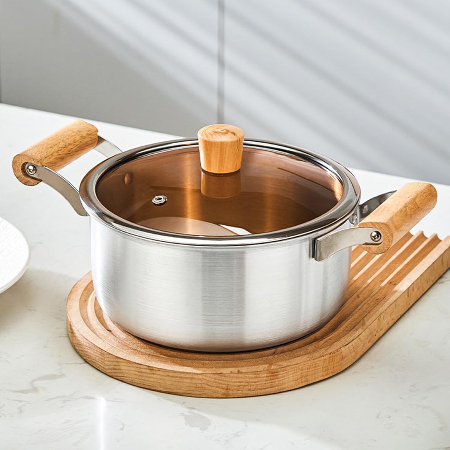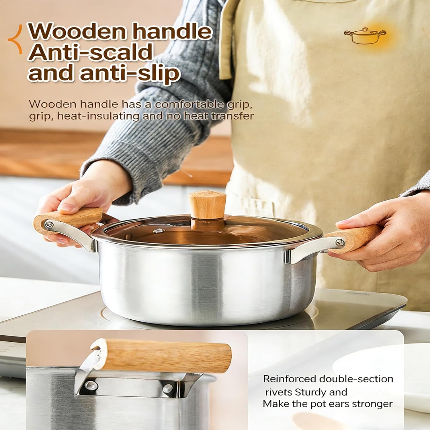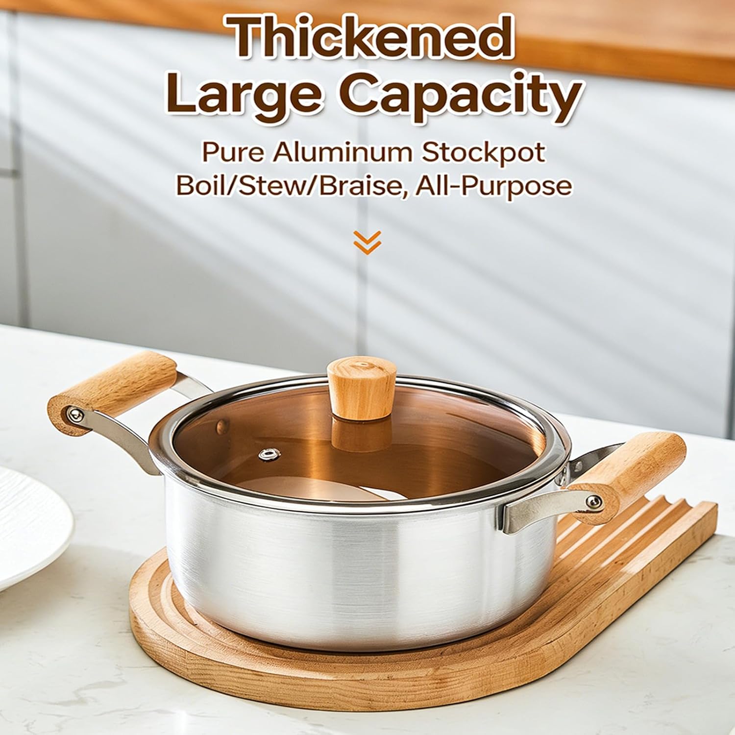 Multipurpose Aluminum Pot with Double Wood Handle Glass Cover Suitable for Induction Cooktops Even Heating Features: Safe Construction: Made from aluminum without coatings, this cooking pots supports safe meal preparation for families focused on wellness Perfect for daily soups and slow cooking dishes Superior Heat Conduction: The aluminum build delivers fast and even heat spread, enhancing cooking Great for busy households needing efficient mealpreps option Easy to Handle Design: Compared to traditional cast iron cookware, this aluminum vessel allows simpler control during food preps Especially useful for elderly users or those with limited strength Natural Wood Handle: Features a practical wooden grip that stays comfortably warm during use, avoiding heat transfer Ensures stable control throughout prolonged cooking tasks Multi Purpose Cookware: Suitable for various kitchen tasks including pasta cooking, broth making, and slow cooking across different heat sources like induction and stove A must have for varied culinary needs Specifications: Component: Aluminum, Wood Color: As pictures shown Size: approx 31.5x15.5cm / 12.4x6.1in Package Includes: 1pc aluminum soup pots with lid Note: Please allow 1-3cm error due to manual measurement please make sure you not mind before you bid Due to the differences between different monitors, the picture may not reflect the item actual color