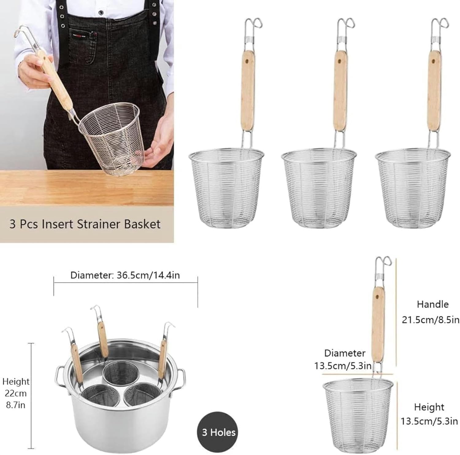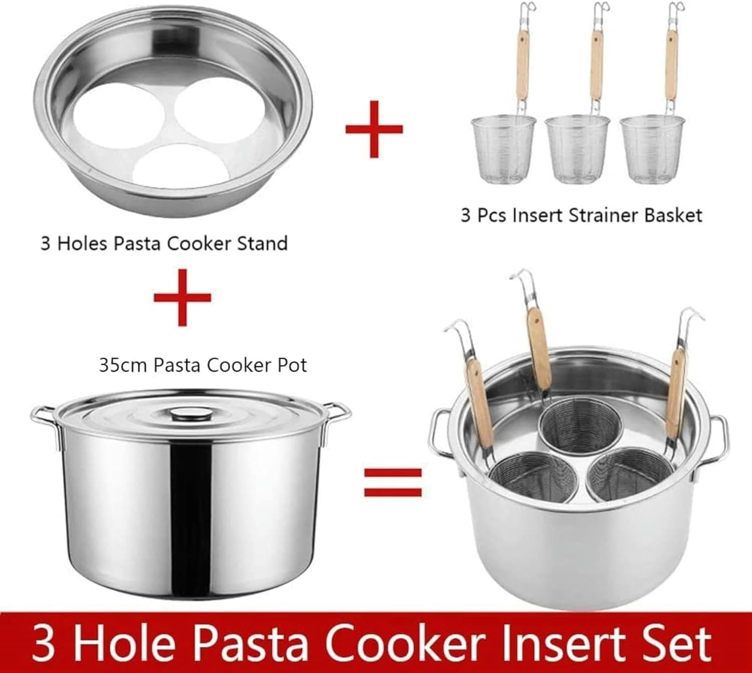Our Pasta cooker steamer is widely used in cafeterias, restaurants, food stalls and other food production places. It can be used to cook noodles, pasta, dumplings, soup, etc.This family-size Pasta Cooker/Steamer Set makes cooking and draining pasta easy. With 3 Inserts strainer basket, dinner has never been easier. Includes a hangable steel lid for healthier, steam cooking.Feature: 1. Mirror finish, Classic looks.2. Stainless Steel for Professional Results.3. Aluminum encapsulated base heats quickly and spreads heat evenly. 4. Three Inserts strainer basket, Convenient to use.5. Cool Grip Handles, Dishwasher Safe.6. Ideal kitchen cookware Multipots to use as pasta pot, spaghetti pot, noodle steamer, vegetables steamer, meat steamer pot stainless steel in one set.SpecificationsName: Pasta Cooker Insert SetMaterial: 201 Stainless SteelColor: SilverSize: Pot Size: 22x36.5cm/8.7x14.4 inchesInsert Strainer Basket Size: 13.5x13.5x21.5cm/5.3x5.3x8.5 inchesSuitable: Induction Cooktop, Gas, Electric, Ceramic CooktopsWeight: 4kg/8.8LbsPackage List: 1 x Pasta Cooker Pot1 x Pasta Pot Stand1 x Pasta Cooker Pot Lid3 x Insert Strainer Basket