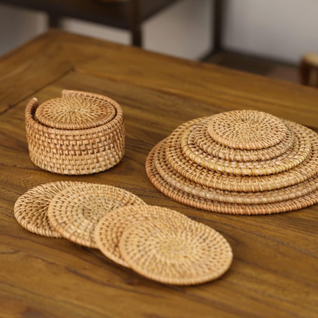 Hand-woven thermal insulation and anti-scald coasters decorate the home environmentEffective non-slip, protect the desktop from burnsThickened dense stitching - neat edge, beautiful hand-woven, not easy to loosen Heat insulation and anti-scalding - protect the desktop, thick texture, better insulation effectNot easy to deformation, the choice of natural rattan material, hand-woven, not easy to deformation looseningName: Rattan coasterColor: dark yellowMaterial: Autumn rattanSize: 8cm, 13cmCraft: hand-wovenApplicable scenes: Tea table, dining table, living roomNotes.Rattan is taken from natural materials, hand-woven, size and color there are slight differences, some spots, burrs, is normal.The non-slip bottom layer of the mat can effectively dampen the shock. Multi-purpose, enjoy the convenience.