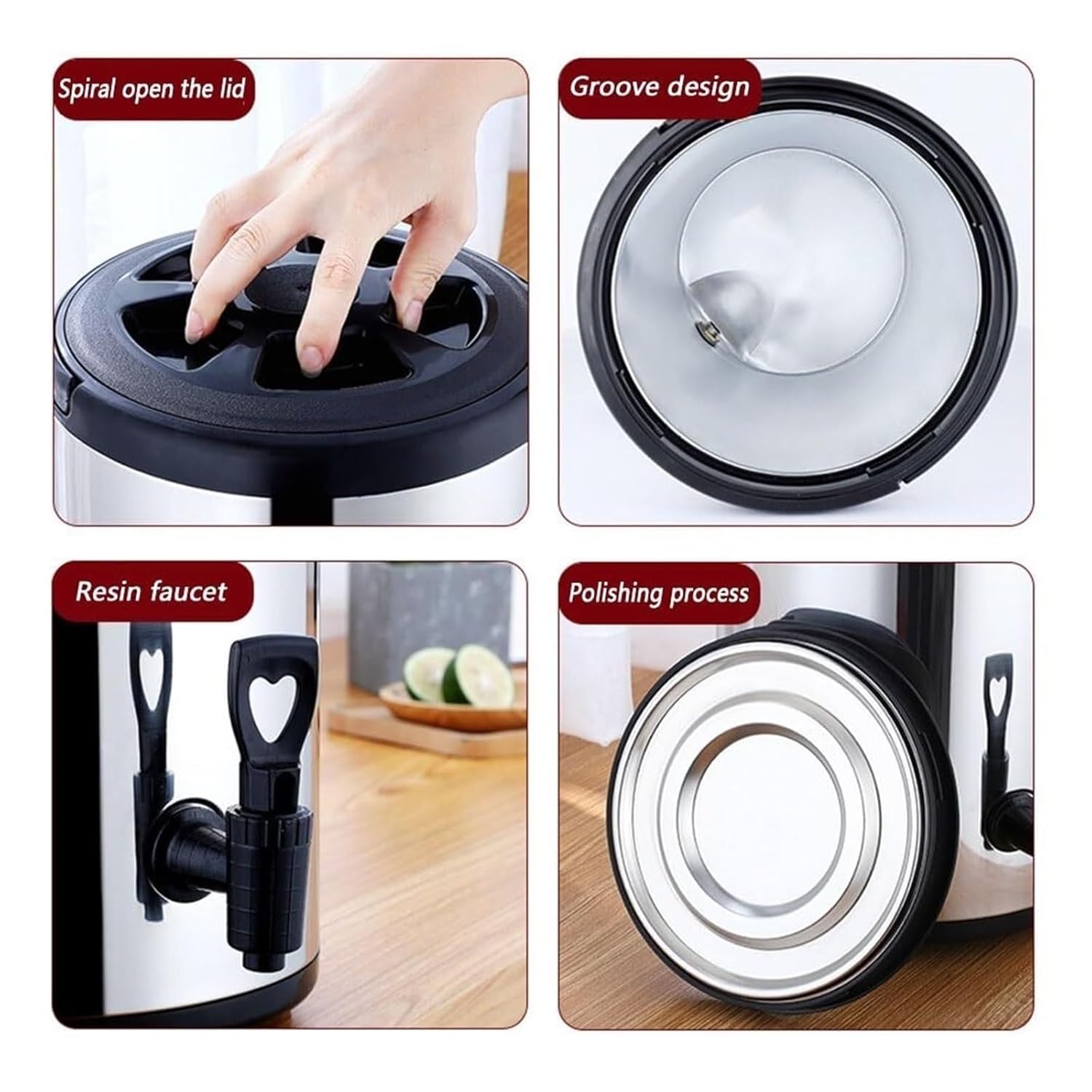 Product OverviewMeet the ultimate commercial hot water dispenser designed for businesses that need reliable, long-lasting heat retention without electricity. Crafted from food-grade stainless steel and fully insulated with PU foam, this water urn maintains temperature for 10-12 hours, making it perfect for all-day operations. The heavy-duty resin faucet resists high temperatures, while the portable design enables easy movement between locations.Key FeaturesLong-Lasting Heat Retention: Double-wall stainless steel with full PU foam insulation keeps contents hot for 10-12 hours naturallyCommercial-Grade Materials: Stainless steel interior and exterior resists rust, odors, and stains; wide mouth enables easy cleaningStable & Secure: Foldable stand with triangular base provides extra stability during useEasy Transport: Integrated carrying handle makes moving this dispenser simple, even when fullMultiple Sizes Available: Choose from 6L, 8L, 10L, or 12L capacities to match your business needsSpecificationsMaterial: Stainless Steel (Inner & Outer), Resin FaucetInsulation: PU Full FoamCapacity Options: 6L, 8L, 10L, 12LHeat Retention: 10-12 Hours (Natural Insulation)Faucet Material: High-Temp Resistant ResinFeatures: Wide Mouth, Foldable Stand, Carry HandleIdeal ForCoffee Shops, Restaurants, Catering Services, Offices, Hotels, Conferences, Parties, Food Trucks, Outdoor Events, Tea Houses, and CampingPackage Includes1 x Hot Water Dispenser with FaucetNote: This unit provides physical insulation only without heating function