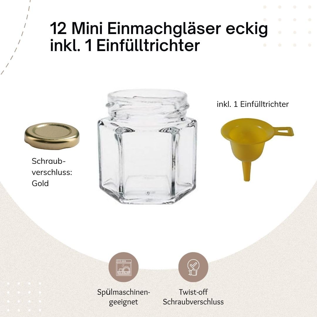 12 x Mini Preserving Jars 6–Angle with Gold Screw-On Lids for Jam, Geeles, salt, oils, etc. Dimensions: H5 x 5 x 1.97 inch (5 cm) opening diameter: approx. 1.38 inch (3,5 cm)-Including a Yellow Funnel.