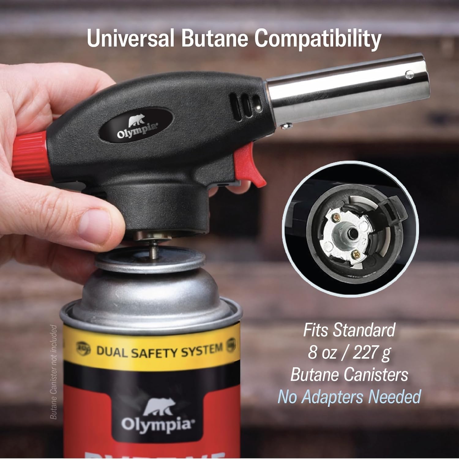 Olympia has been a trusted name in outdoor recreation since 1971, delivering dependable tools built for real-world performance. From weeknight dinners to weekend BBQs, this high-heat butane torch lighter is designed for moments when precision and power matter. With instant auto piezo ignition and a concentrated flame reaching up to 1,000°C, it makes searing, caramelizing, and fire-starting fast, easy, and controlled. The precision flame design provides focused heat exactly where you need it—perfect for use as a kitchen torch, in crafts, soldering, and DIY applications. Its efficient 1.1 kW heat output and low fuel consumption of just 80 g/h deliver strong performance without wasting gas. Built with safety in mind, this torch features a pre-heating anti-flare function to help maintain a stable, steady flame. It is ETL certified and compatible with standard 8 oz (227 g) bayonet-style butane canisters for a secure, leak-free connection. Compact, portable, and versatile, this torch is ideal for kitchens, camping trips, BBQs, picnics, emergency kits, and everyday home use. Constructed from durable ABS plastic and stainless steel, the Olympia Cooking Torch Single comes in a sleek black and silver finish and includes three cooking torches in the package.