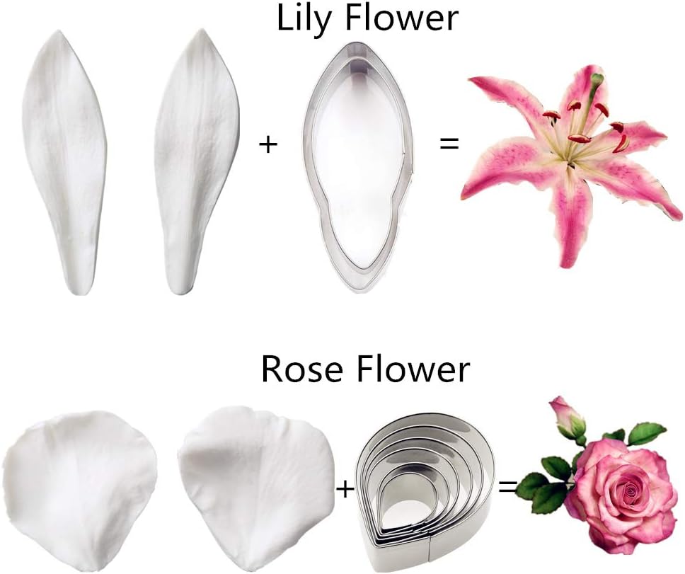 | Included Components | 2pcs peony flower veining molds, 2pcs Rose molds, 2pcs Lily molds, 2pcs Daisy molds, 2pcs Eustoma Lisianthus molds, 2pcs Ginkgo molds, 2pcs Senecio Cineraria molds, 2pcs Corn poppy flower molds, 4pcs Peony cutter, 6pcs Rose cutter, 2pcs Lily cutter, 3pcs Daisy cutter, 3pcs Eustoma Lisianthus cutter, 2pcs Ginkgo cutter, 3pcs Senecio Cineraria cutter, 3pcs Corn poppy cutter |