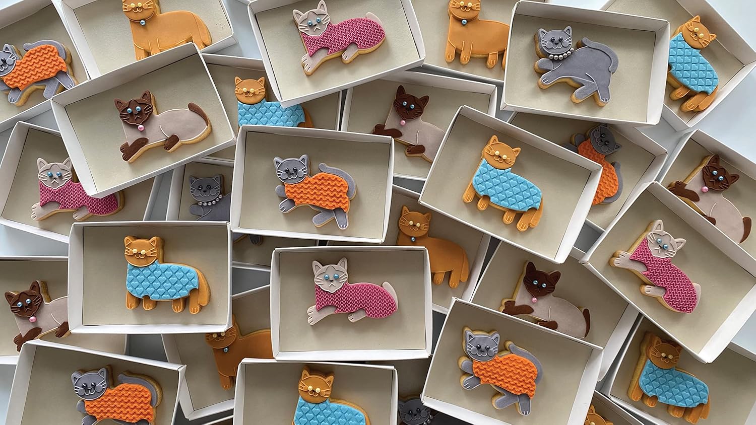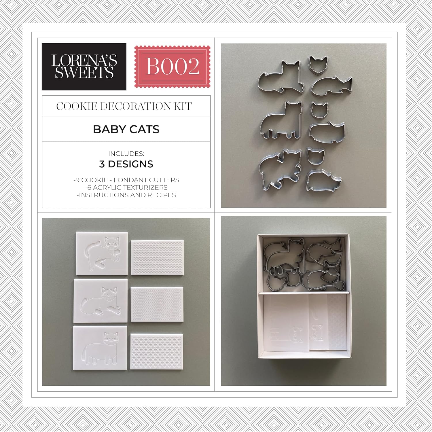 BABY CATS Cookie Decoration Kit by Lorena’s Sweets. This product is designed to enable you to produce professional looking cookies. This kit includes: 3 Original cookie designs. 9 Cookie cutters for cutting shapes out of cookie dough or fondant. 6 Acrylic texturizers for stamping fondant. General recipes and instructions. Size of the cookie cutters: 2.7 x 2.4 inches , 2.6 x 2.4 inches , 2.6 x 2.1 inches , 2.6 x 1.3 inches , 2.2 x 1.3 inches , 2.2 x 1.2 inches , 1.2 x 1.1 inches , 1.1 x 0.9 inches , 1.0 x 0.9 inches