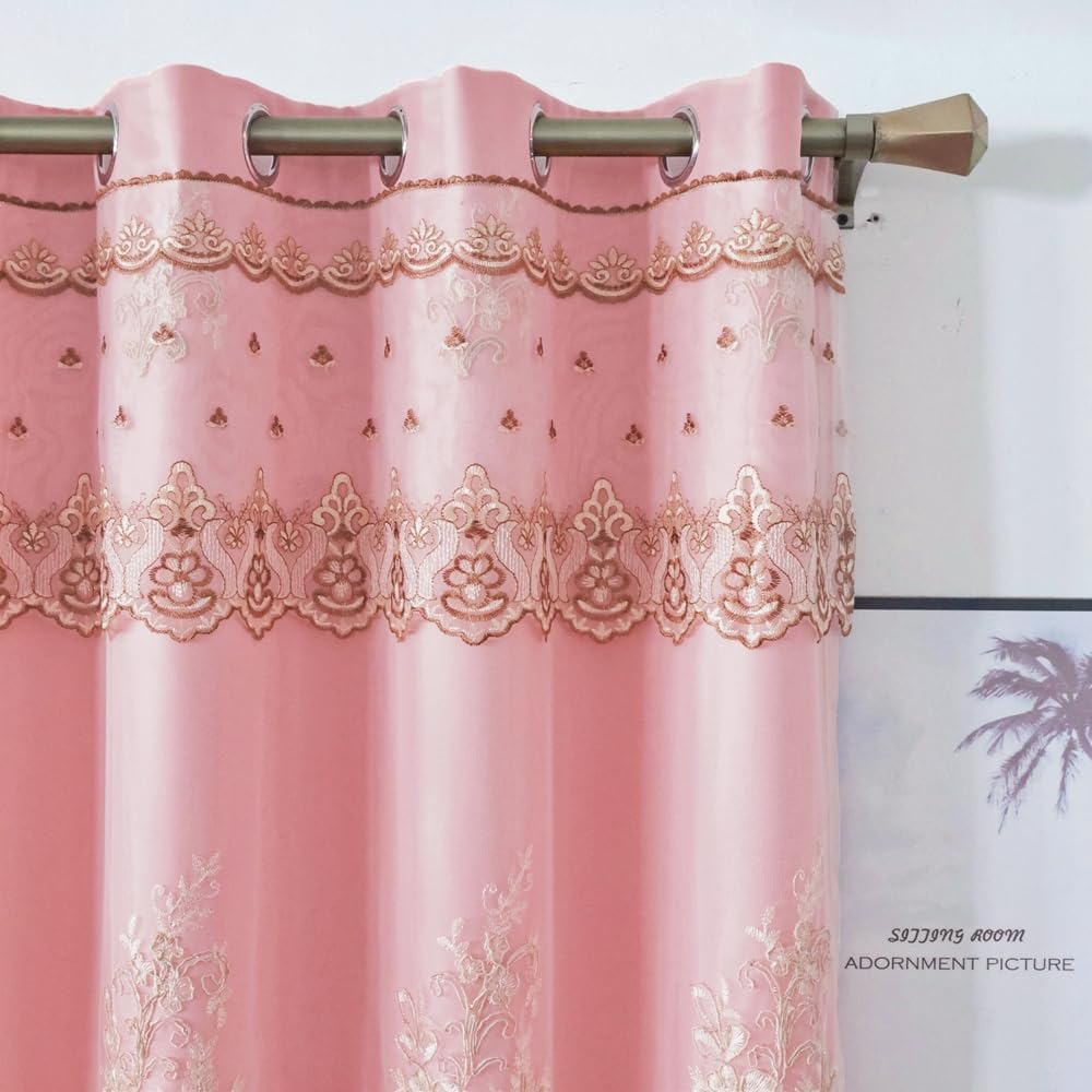 Features: Double layered curtain design, with one layer of solid color fabric curtains and another layer of embroidered sheer curtains, combining shading and aesthetics. The European style embroidery has improved the quality of the product.