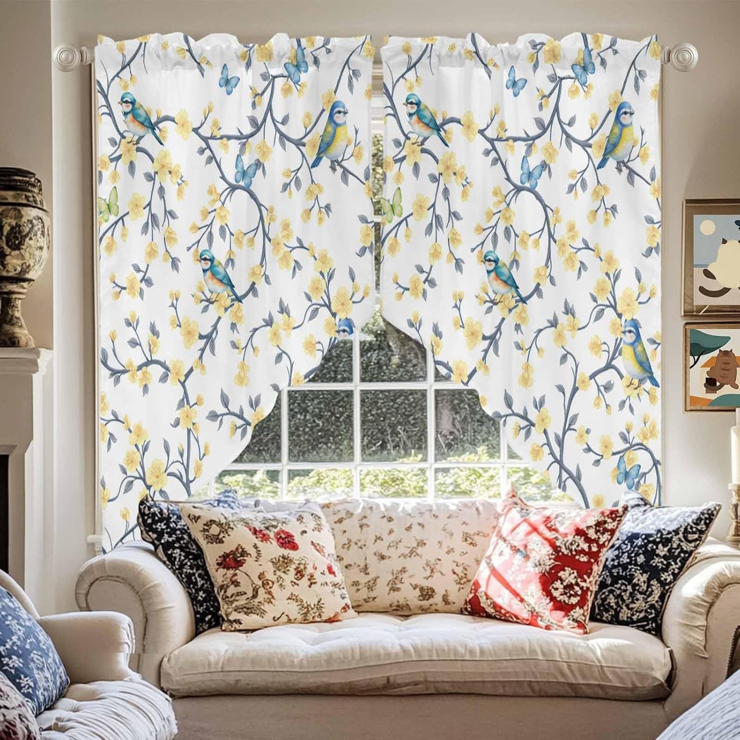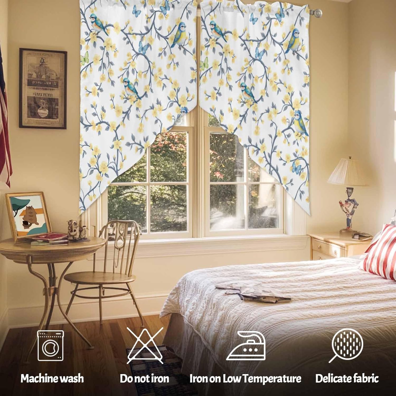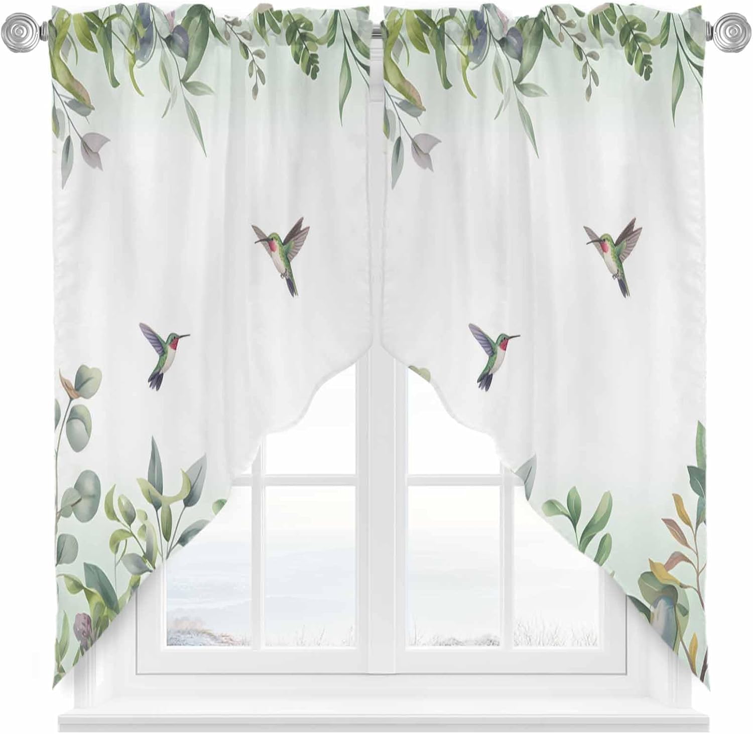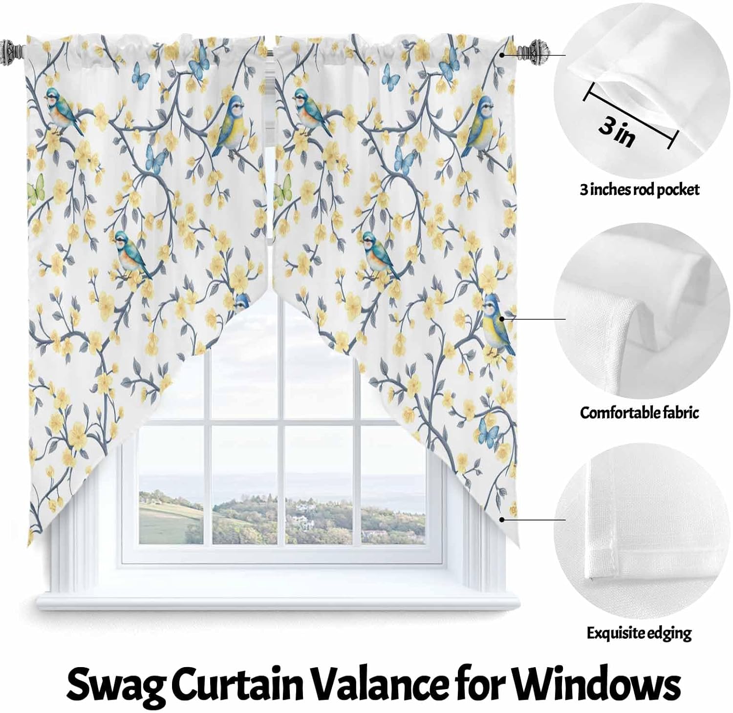 Size28 x 36 inches*236 x 36 inches*236 x 45 inches*236 x 63 inches*2MaterialMade of polyester, soft, durable, lightweight and breathable. Block out some unwanted sunlight and get privacy. 2 panels per package, 3 inch rod pocket, fits most of the curtain rodsGreat DecorCharming decorative swag kitchen curtains add amazing look to host and guest. These elegant and functional kitchen window curtains valances can be hung alone or mixed with other curtains, bring the beauty and a new look into your home decorEasy CleanMachine washable, dry at low temperature. Don’t use bleach. Don’t use sharp things scratching curtains