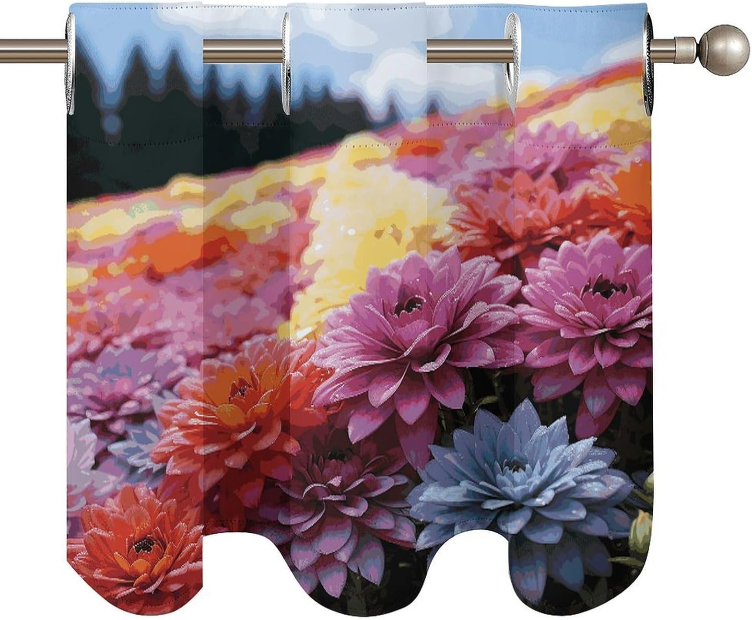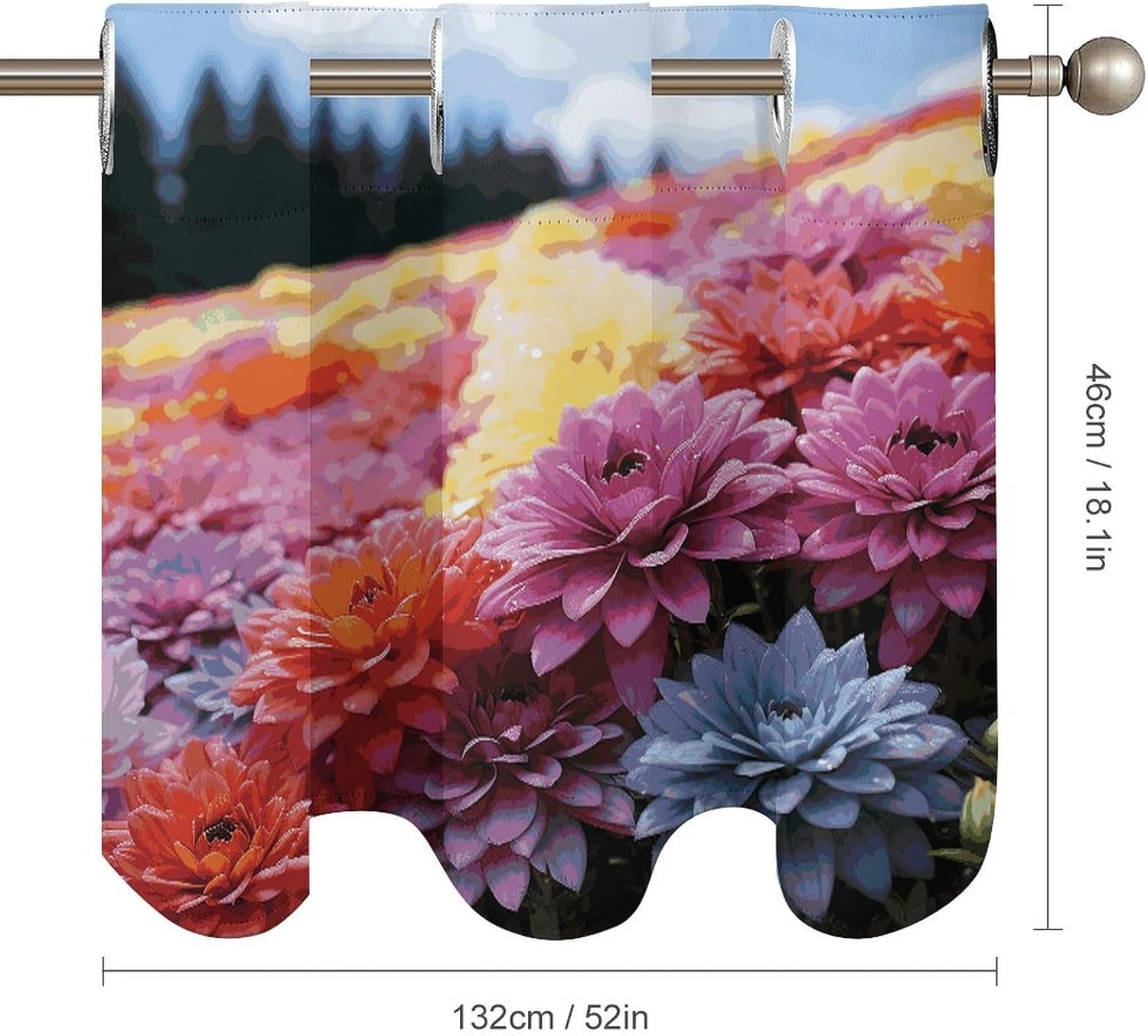 Perfect Pair Printed Curtain - Rainbow Flower Sea Light Filtering Modern Window Décor Elevate your windows with our beautifully designed two-piece Rainbow Flower Sea curtain set, combining a functional printed curtain with an elegant coordinating valance. Crafted for versatility, this Rainbow Flower SeaCurtain is the ideal solution for adding privacy, style, and controlled light to any room. Premium Fabric & Modern Design: Crafted from premium fabric, this Rainbow Flower Sea Curtain maintains a soft hand-feel and a graceful drape over time. The elegant print and smooth texture provide a sophisticated look that enhances your home's ambiance. Optimal Light Filtering & Protection: This Rainbow Flower Sea modern curtain effectively filters harsh sunlight, creating a softly illuminated and comfortable atmosphere. It helps protect your furniture and flooring from UV damage while providing a good level of privacy. The fabric is resilient and designed for easy care. Versatile Application: This Rainbow Flower Sea ready-to-hang Curtain is designed for broad compatibility. The curtain features standard 4.5cm grommets for smooth gliding on most curtain rods. With dimensions of 52" W x 18.1" H per panel, it's perfectly suited for various window styles. Ideal as a charming kitchen curtain or cafe curtain for bottom-up coverage, it also functions perfectly as a tier curtain. Whether you're looking for a stylish printed curtain for your living space, a functional light filtering curtain for a bedroom, or a complete look with a curtain valance, this Rainbow Flower Sea set delivers both style and purpose. Set Includes: Two printed curtain panels Bring a cohesive and stylish upgrade to your home with this Rainbow Flower Sea versatile curtain .