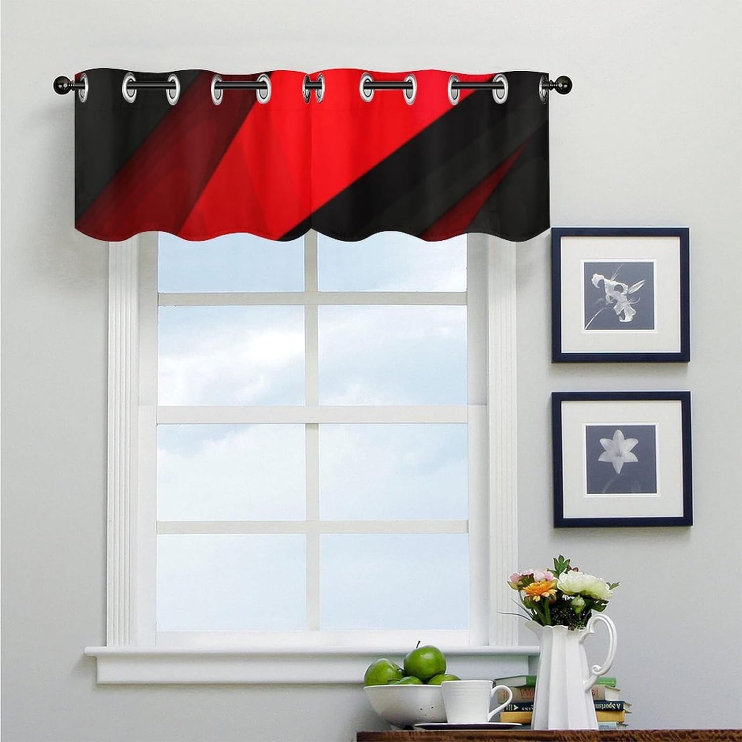 Introducing our 2-piece Red Black Curtain Valance, a wonderful blend of functionality and elegance to elevate your window decor. Measuring 52 x 18.1 inches per piece, this Red Black curtain set fits most windows, making it a versatile choice for any room. Crafted from premium curtain fabric, it combines soft touch with long-lasting durability, bringing comfort and practicality to your space. This Red Black modern curtain features an elegant appearance and smooth texture, adding sophistication to your windows. As a light filtering curtain, it gently softens sunlight while providing moderate privacy, creating a warm glow—ideal for spaces wanting natural light without harsh glare. It also boasts impressive light-blocking performance, insulating your room from heat, protecting furniture and floors from UV damage, and creating a comfortable environment for better sleep. Designed for convenience, each Red Black curtain has a 4.5cm curtain hole for easy installation on most rods. The washable fabric maintains its shape and softness after multiple washes, with nice drape to keep it neat. Whether you need a kitchen curtain, cafe curtain for a cozy nook, or tier curtain for layered decor, this Red Black set fits well. Versatile and stylish, this Red Black set works seamlessly as Valances or Curtain Valance, complementing various decor styles. It can also be used as a printed curtain to add a subtle decorative touch to your living room, bedroom, kitchen, or other spaces. Suitable for most windows, this Red Black modern curtain is a practical that combines functionality with timeless style. Upgrade your window treatments with our 2-piece Red Black Curtain Valance set—where quality, style, and functionality meet.