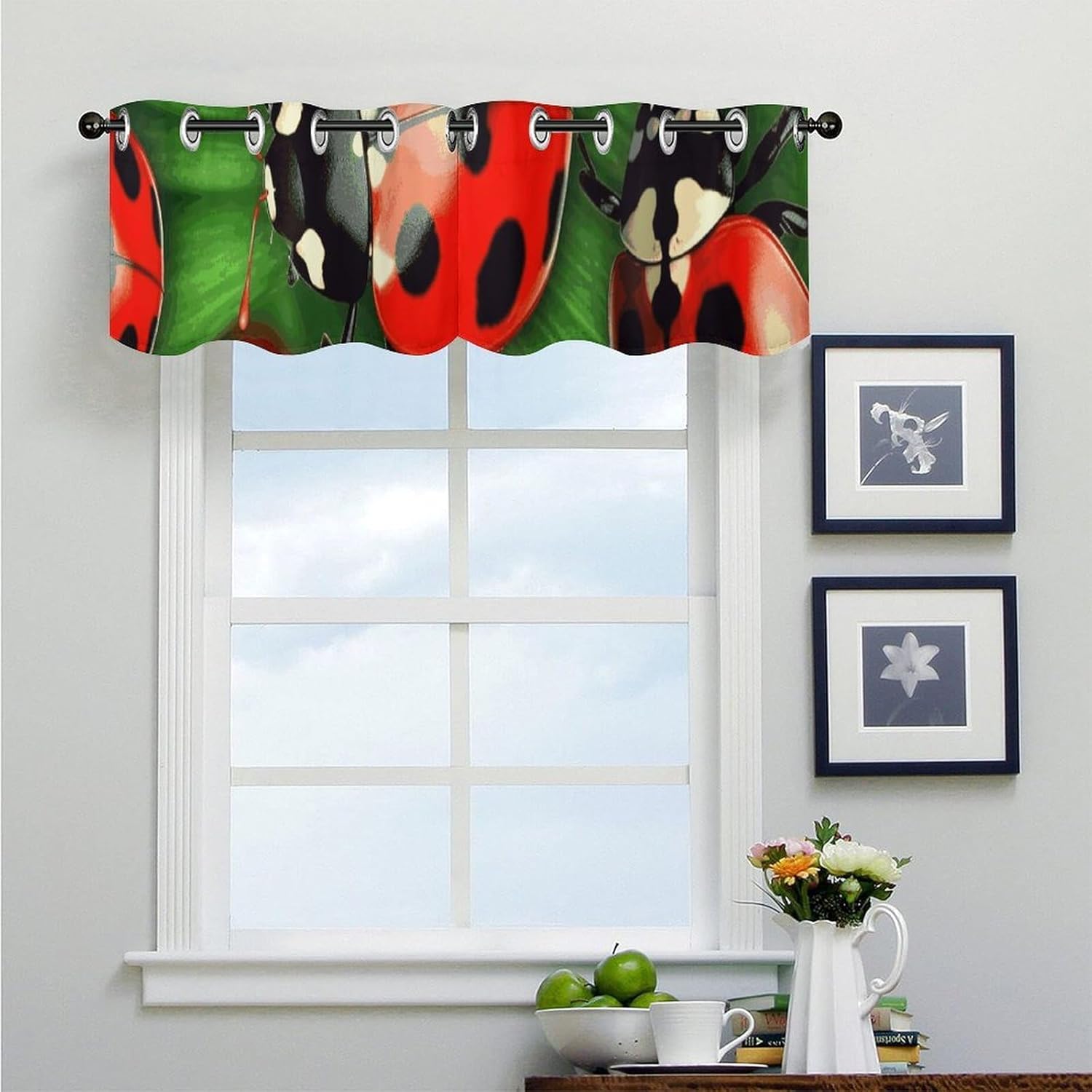 Introducing our 2-piece Red Ladybug Curtain Valance, a wonderful blend of functionality and elegance to elevate your window decor. Measuring 52 x 18.1 inches per piece, this Red Ladybug curtain set fits most windows, making it a versatile choice for any room. Crafted from premium curtain fabric, it combines soft touch with long-lasting durability, bringing comfort and practicality to your space. This Red Ladybug modern curtain features an elegant appearance and smooth texture, adding sophistication to your windows. As a light filtering curtain, it gently softens sunlight while providing moderate privacy, creating a warm glow—ideal for spaces wanting natural light without harsh glare. It also boasts impressive light-blocking performance, insulating your room from heat, protecting furniture and floors from UV damage, and creating a comfortable environment for better sleep. Designed for convenience, each Red Ladybug curtain has a 4.5cm curtain hole for easy installation on most rods. The washable fabric maintains its shape and softness after multiple washes, with nice drape to keep it neat. Whether you need a kitchen curtain, cafe curtain for a cozy nook, or tier curtain for layered decor, this Red Ladybug set fits well. Versatile and stylish, this Red Ladybug set works seamlessly as Valances or Curtain Valance, complementing various decor styles. It can also be used as a printed curtain to add a subtle decorative touch to your living room, bedroom, kitchen, or other spaces. Suitable for most windows, this Red Ladybug modern curtain is a practical that combines functionality with timeless style. Upgrade your window treatments with our 2-piece Red Ladybug Curtain Valance set—where quality, style, and functionality meet.
