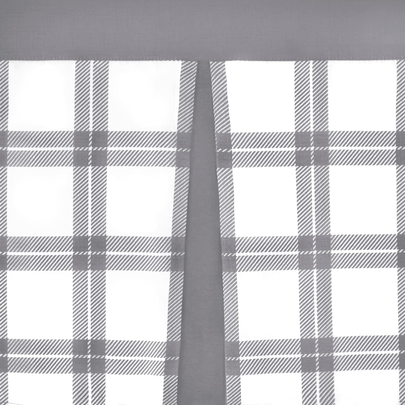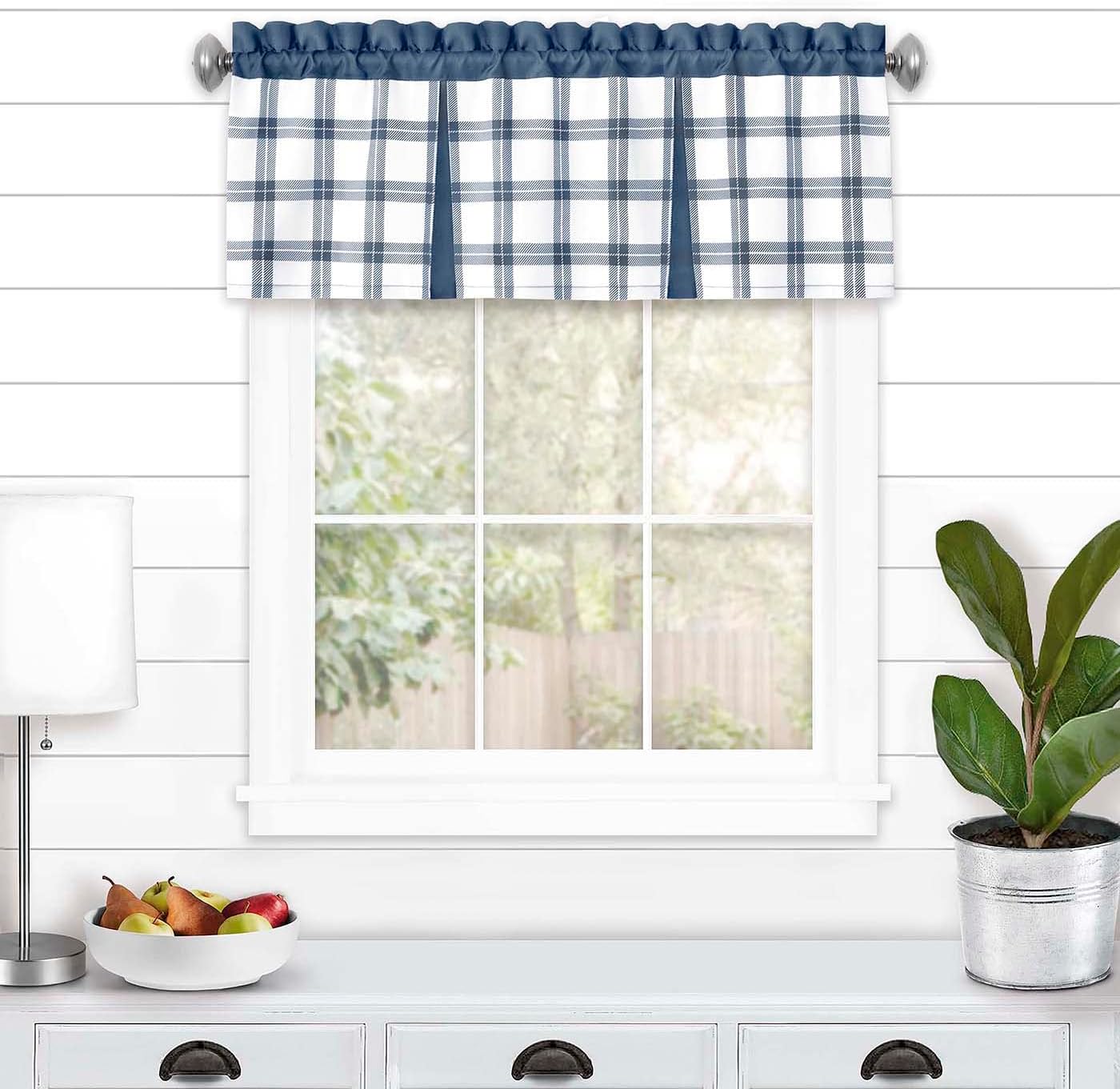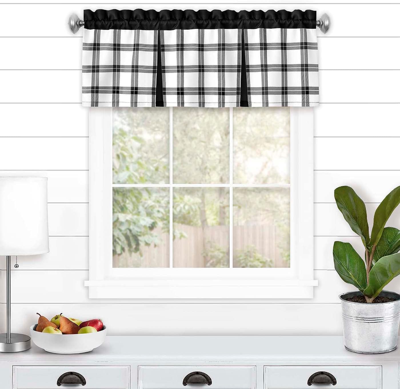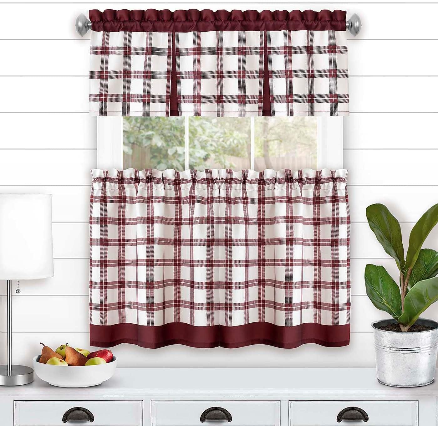 Tate Tier and Valance Set: The Tate Tier and Valance Curtain Set combines a windowpane plaid design with solid bold accents. The valance and tiers are crafted to seamlessly line-up for a custom-look window treatment. Tiers have solid colored bottom bands, while the valance has solid colored header and two solid colored kick pleats.