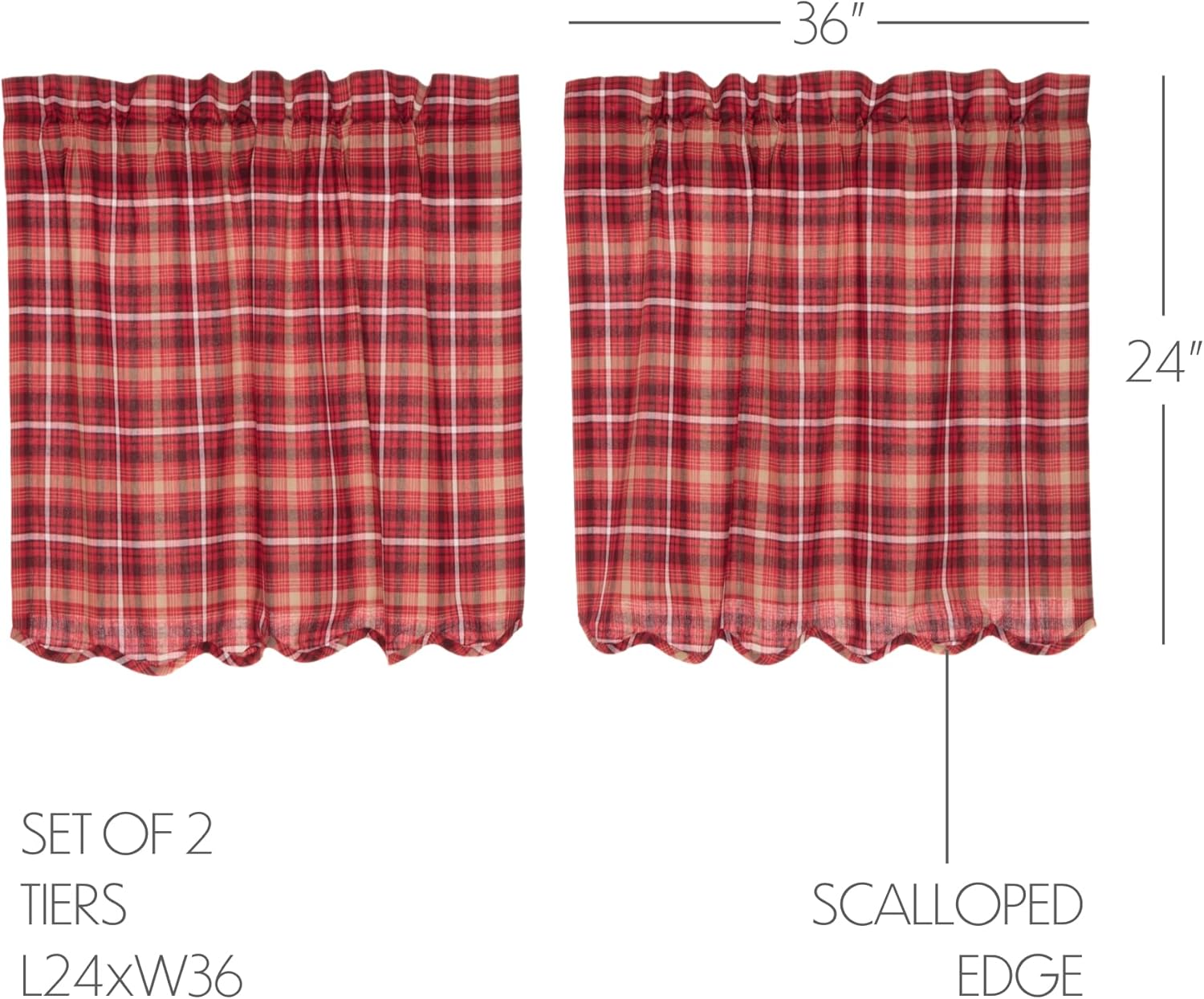 Embracing traditional American plaid, the Braxton Scalloped Window Tier Set inspires primitive and rustic Americana looks with its apple red, tan, ebony black color on soft, 100% cotton fabric. The scalloped edge lends a soft feel, while the rich red apple hue of these 24x36 short, tier-style curtains brings warmth to your kitchen and dining room. The white cotton lining on the back of our curtains helps filter light and a rod pocket makes hanging convenient and easy.