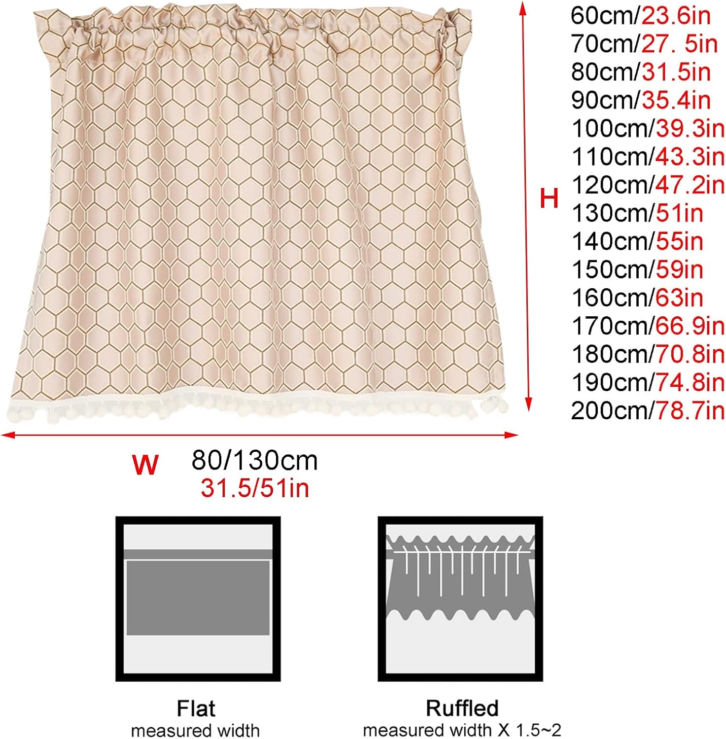 ◈ The pink polygonal lattice half curtain, full of romantic mood, adds a subtle texture to any room. Add a pop of color to your kitchen, living room or dining room.◈ Elegant and stylish, short curtains are the most user-friendly decorative hanging option for those who want to block out the sun, take a nap or keep the sun away from the TV.◈ Main features▸ Selected high-quality fabrics, delicate workmanship, durable▸ Thick fabric, good shading effect▸ Protect your privacy▸ Cabinets, windows, cabinets, interior doors can be used▸ Rod Pocket Design, easy for Install▸ Hand washable, machine washable in laundry bag◈ Specifications▸ Product Name: Plaid lace Short Half Curtain▸ Style: Modern fresh country style▸ Color: Pink▸ Material: Blended fabric▸ Process: high precision jacquard▸ Function: Decoration, Blackout▸ Size: WidthxHeight. W80xH60cm/53.5x23.6in, W130xH60cm/51x23.6in, W130xH70cm/51x27.5in, W130xH80cm/51x31.5in, W130xH90cm/51x35.4in, W130xH100cm/51x39.3in, W130xH110cm/51x43.3in, W130xH120cm/51x47.2in, W130xH130cm/51x51in, W130xH140cm/51x55in, W130xH150cm/51x59in, W130xH160cm/51x63in, W130xH170cm/51x66.9in, W130xH180cm/51x70.8in, W130xH190cm/51x74.8in, W130xH200cm/51x78.7in▸ The package includes: 1 short curtain (not including the rod)◈ Care instructions ▸ Gently hand wash in lukewarm water or machine wash in a laundry bag, do not bleach. Do not scratch the curtains with sharp objects.◈ Tips▸ The size is measured by hand, there may be 1-3 cm error.▸ All pictures are taken in kind, but the color of the product you see in the pictures may be slightly different due to different shooting light, screen and monitor. Subject to the actual color.