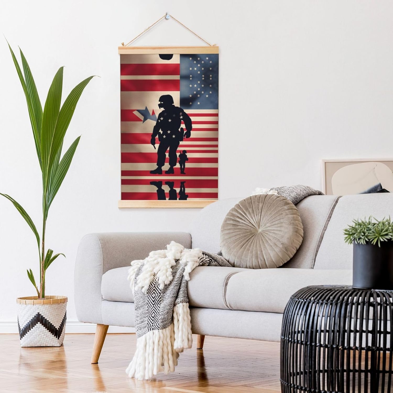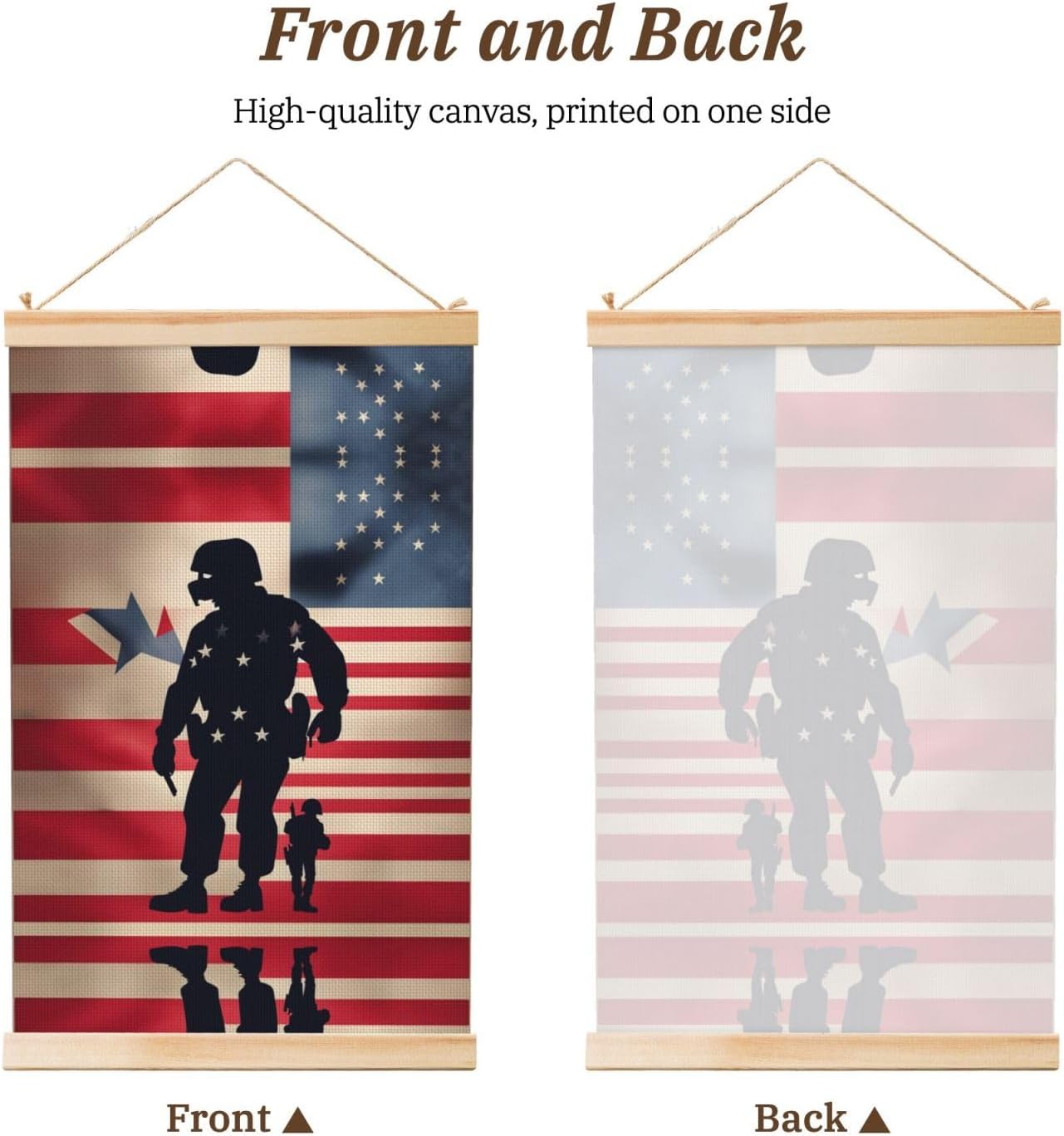 Our Us Military Soldiers Patriotic Memorial Day Print Wooden Poster Hanger Is An Excellent Addition To Your Home Decor Or A Perfect Gift For Friends And Family. Made Of Selected Quality Canvas With Brilliant And Enduring Colors, This Wall Art Is Designed To Resist Water, Dust, And Fading, Ensuring The Bright And Vibrant Art Lasts. The Polyester Is Enclosed Between Two Teak Wood Hanger Scrolls With An Attached 35cm Rope For Easy Hanging. Installation Is Made Simple With The Included Two Nails In A Plastic Box. The Modern Minimalist Style Of Our Wall Hanging Complements Any Home Decor, Elevating The Artistic Ambiance And Brightening Up The Room. Experience The Elegant Transformation This Wall Hanging Scroll Painting Brings To Your Spaces Today.