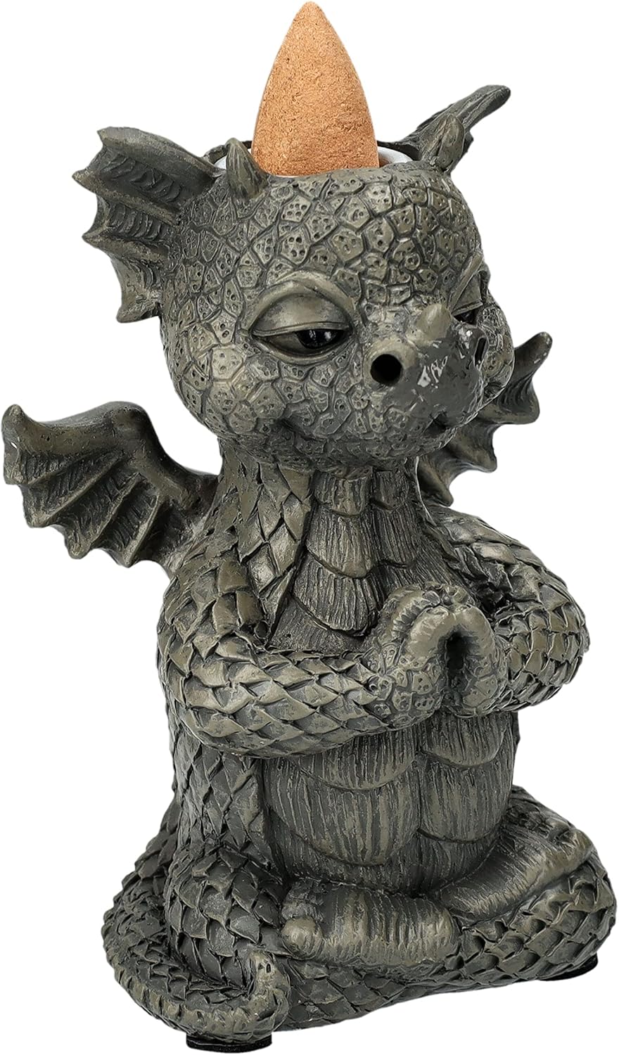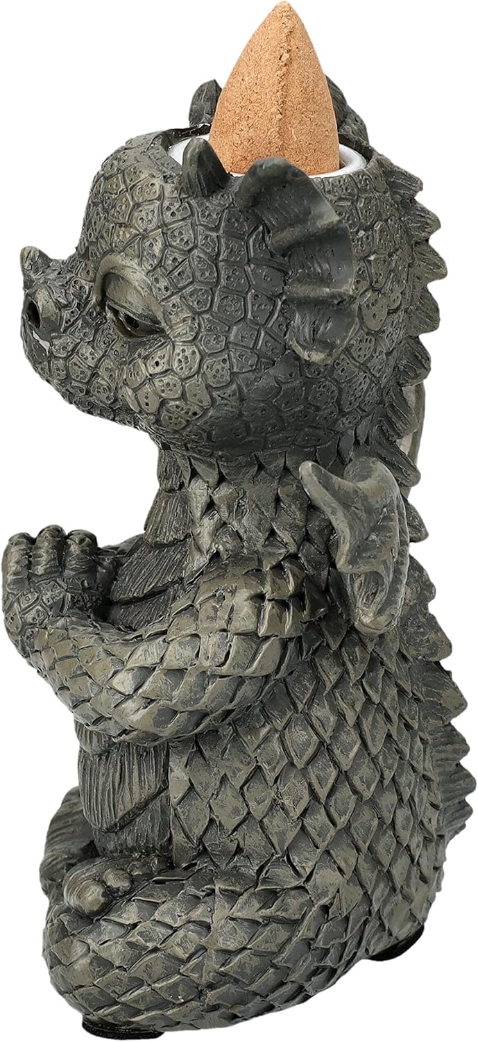 Add a touch of whimsy and mystical charm to your space with this enchanting dragon incense holder. Standing 4.25 inches tall, this detailed figurine depicts a dragon in a peaceful meditation pose, complete with intricate scaled texture and decorative wings. The stone-look gray finish gives it an authentic ancient artifact appearance, perfect for gothic and fantasy-themed decor. The clever design features a cone incense burner at the top, creating a mesmerizing effect as the smoke cascades down the dragon's form. Crafted from durable resin with fine attention to detail, from the textured scales to the serene expression, this piece serves as both a functional incense holder and an eye-catching decorative accent. Whether placed in your meditation space, on a desk, or as part of your mystical collection, this meditating dragon brings together functionality and fantasy in one captivating piece.