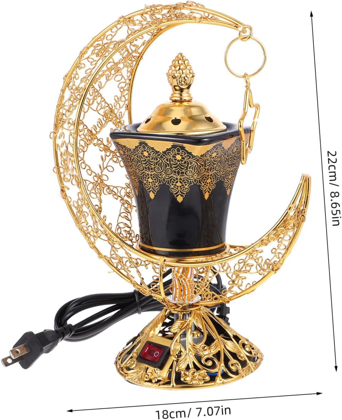 Package List 1 x incense burner Features -Material:Metal, ceramic electric censer burner -Size:22.00X18.00X9.50cm/8.65X7.07X3.73in electronic bukhoor burner -Note: The style of the pattern and the topper decoration is random incense burner arabian home censer. -Color:Golden japanese incense holder -Applicable voltage:AC 110V incense burner for home -Product Info:Electric incense burner - Vintage appearance and bright color, this incense holder has good decorative effect to bring your places a different look decorative electric censer - Light weight and compact size, can be put on the table stably and easy to move insencents burner - The plug in incense burner is safer than a normal incense burner, a better choice for a family incense censer - Made of sturdy material, the electric incense burner is very delicate and sturdy, not easy to break incense burner holder electric. - Proper for and relaxing, you can better enjoy your own resting time by using this censer aroma burner islamGoods Descriptioncenser stand It's ideal for use during your leisure time, whether you're reading a book, taking a break, or sipping a cup of tea.electric incense burner Note: This item comes with US plug, please confirm the voltage of your area before purchasing.electric burner With its eye-catching design featuring bright colors and exceptional craftsmanship, this incense burner is a stunning addition to any space