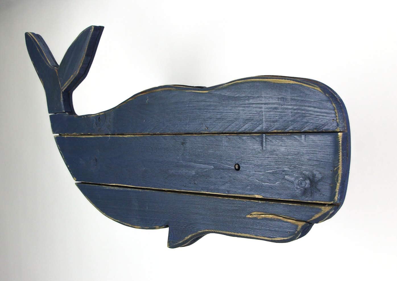 Make a splash with this carved wood whale wall hanging. Made from hand-carved wood planks attached to a wood backing for support, this whale is hand painted and given a rustic worn look on its edges. Two pre-attached hangers give multiple options when hanging this plaque with wall-mounted hooks or screws (not included). Measuring 30 inches long, and 16 inches high, with a 1-inch depth, this whale of wall decor is sure to be a great centerpiece or nautical accent for your living room, kitchen, dining room, bedroom, office, or other indoor living space that could benefit from a dash of seaside adventure.