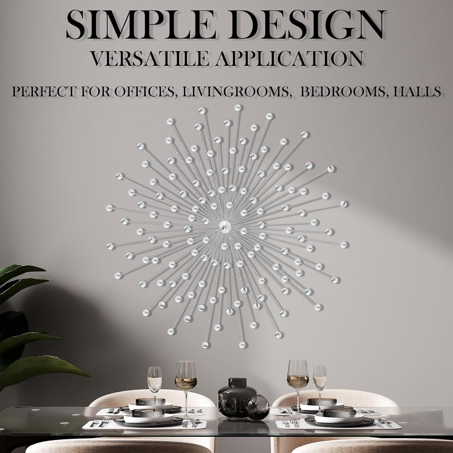 Features: You will receive 1 piece of home decor accents, and you can also share with your friends, to enjoy decorating together. The wall hanging diamond accents serve as delicate gifts, a symbol of beauty and hope. An ideal choice for people who appreciate art and love for exquisite wall decor. Share this creation with your loved ones. Specifications: Material: iron metal, acrylicColor: silver mainlySize: about 23.62 inches/ 60 cm in diameterPackage includes: 1 x Sunburst wall decorsNotes: Manual measurement, please allow slight errors on size. The color may exist a slight difference due to different screen displays.