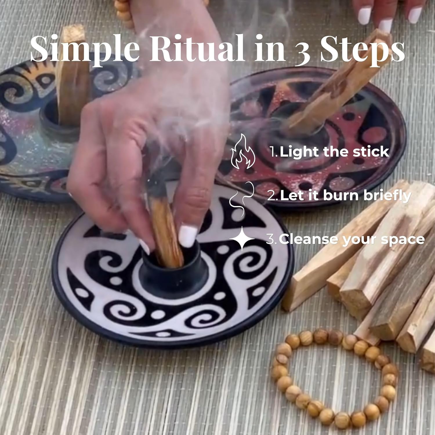 Relax. Breathe. Reconnect. Benefits:🌿Reduces Stress & Anxiety🌿Promotes Relaxation & Better Sleep✨Enhances Mental Clarity✨Cleanses Energy & Refreshes Your Space🌿Emotional Balance & Mood Boost✨Creates a Peaceful Home AtmosphereIn today’s fast-paced world, finding moments of calm is essential. The Relax Box is more than a product — it’s a ritual of well-being. This thoughtfully curated set includes sustainably sourced Palo Santo from Peru and a handcrafted ceramic holder from Chulucanas, created by skilled artisans using traditional techniques. Each time you light Palo Santo, its gentle, woody aroma with citrus notes fills your space — helping you release stress, clear your mind, and restore balance.✨ Create a peaceful atmosphere✨ Cleanse your energy✨ Elevate your meditation or self-care routine🌿 Sustainably harvested & SERFOR certified🏺 Handmade artisan ceramic – every piece is unique🎁 Beautiful eco-friendly packaging – ready to gift Whether for yourself or someone special, the Relax Box brings intention, calm, and authenticity into everyday life. How to Use: Light one end of the Palo Santo stick until it begins to smolder. Gently blow out the flame and allow the smoke to flow. Place it on the ceramic holder and relight as needed. Includes 1 handcrafted Chulucanas ceramic holder (Ø ~5 in, 222 g) and 5 Palo Santo sticks (~4.5 in each). Box dimensions: 6 × 6.4 × 2 in; total weight ~325 g.