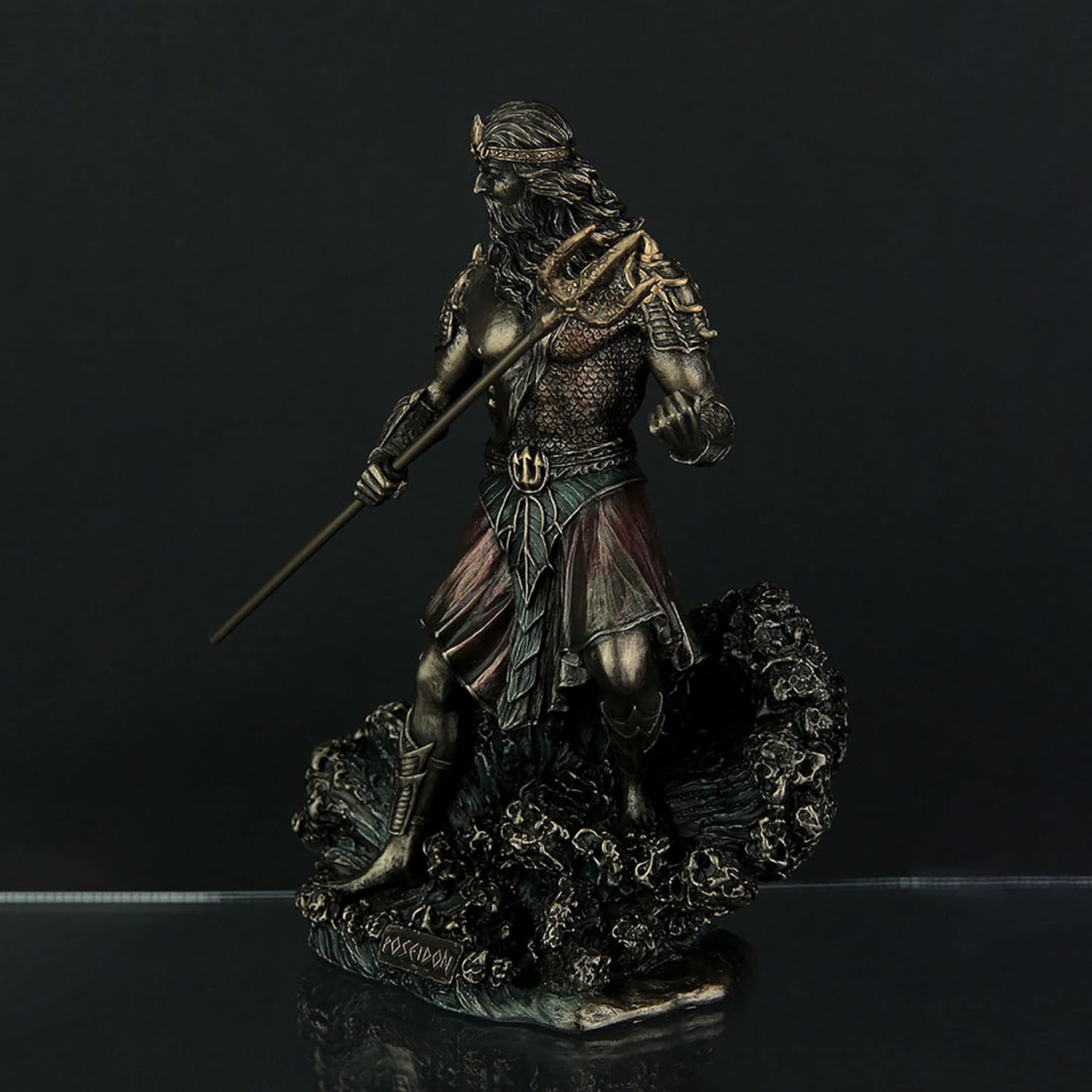 In ancient Greek religion and myth, Poseidon was one of the Twelve Olympians. He was god of the Sea, of earthquakes, and of horses. This cold cast resin statue of Poseidon shows the God of the sea fiercely protecting his watery dominion. The statue has a metallic bronze finish, with hand painted accents to show off the detail.