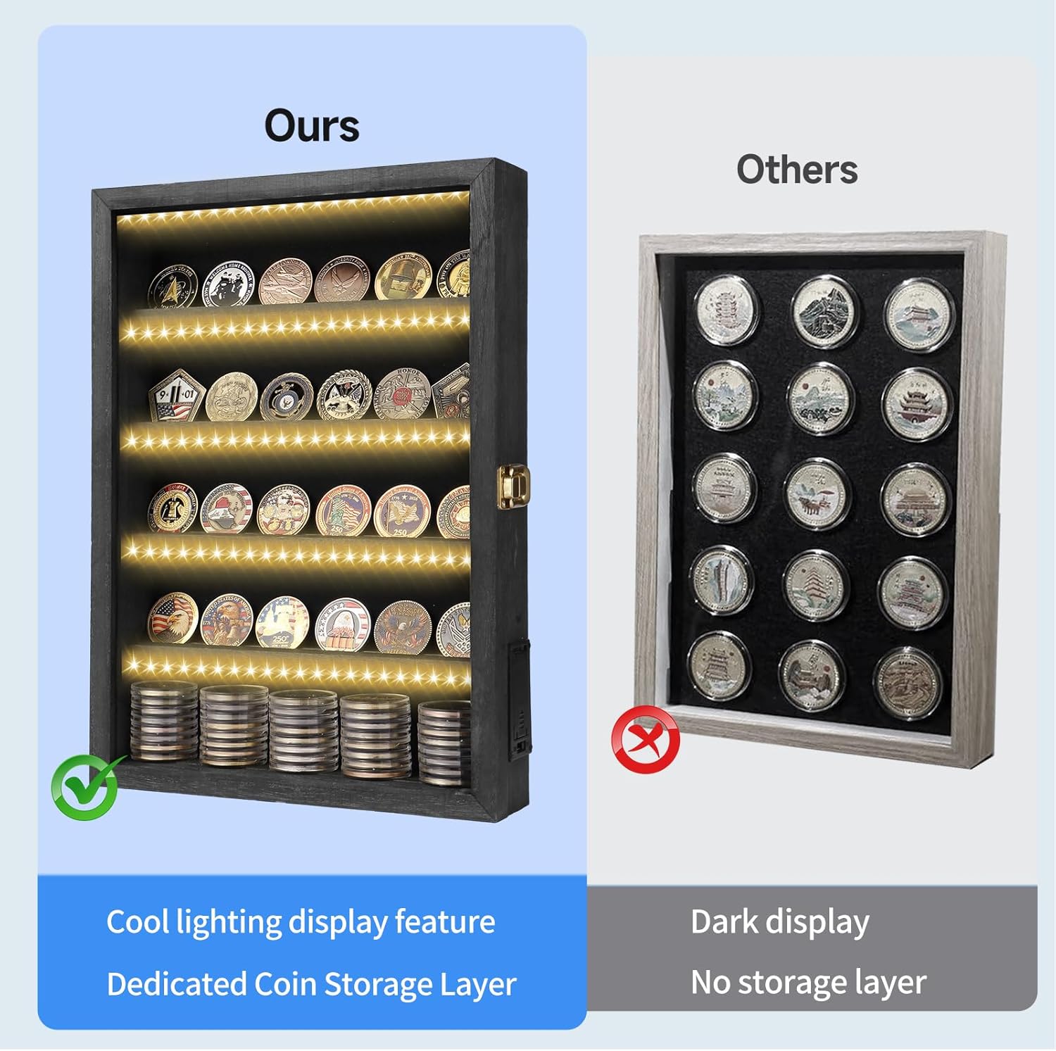 Challenge Coin Display Case with LED, 16x12x3in Black Wood 5-Layer Military Coin Display Case.