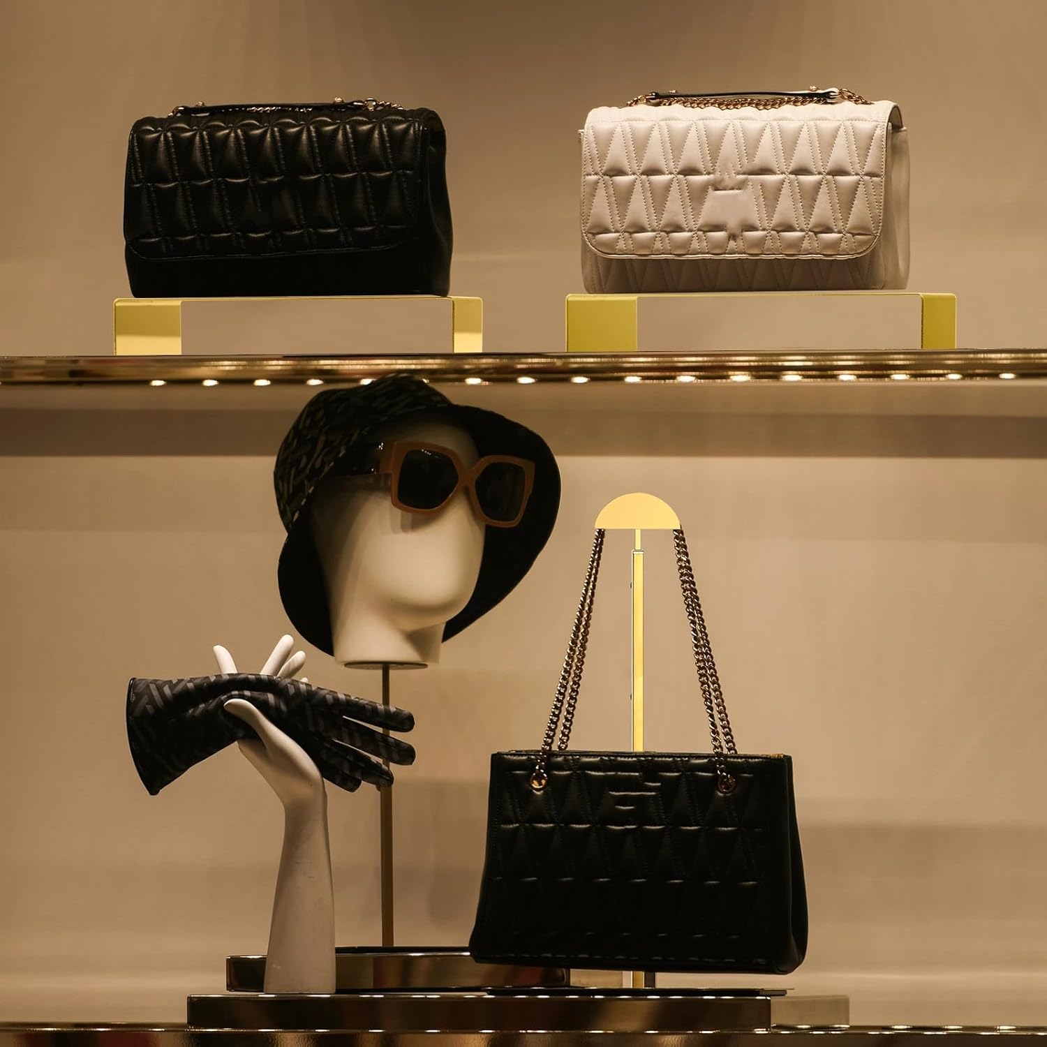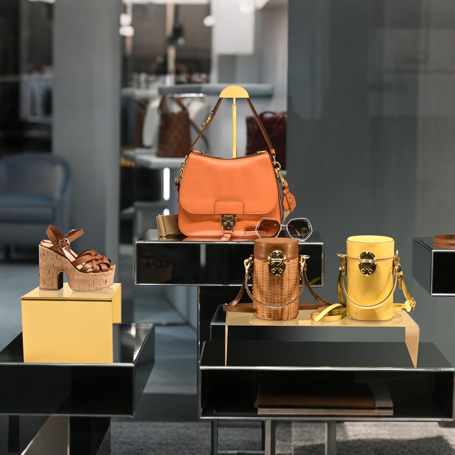 Features: This product features a mirror finish with a premium texture, crafted from quality metal for long-lasting durability. In addition to being sturdy and durable, these shoe handbags stands are also stylish and will enhance the look of any display. The polished gold finish gives them a timeless and elegant look, while the minimalist design ensures that your items are the center of attention Specifications: Material: stainless steel Color: gold Size: Display stand: 8.1 × 3.9 × 2 inches, 8.7 × 3.9 × 3.2 inches, 9.5 × 3.9 × 4.7 inches Purse hanger: purse hanger base are 4.7 x 5.5 inches, height adjustable between 14.5 and 23.6 inches Package includes: 2 Sets of display stand 3 x Purse hanger Notes: Manual measurement, please allow slight errors on size. The color may exist a slight difference due to different screen displays