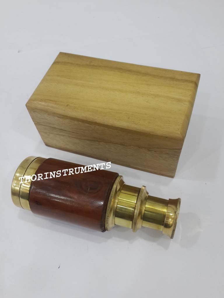 These beautifully crafted, hand-polished, solid brass telescope have been manufactured to reflect the workmanship,This nautical spyglass is made of brass.The telescope, when fully extended, is about 6" long. The scope comes in a Natural wooden nautical box.