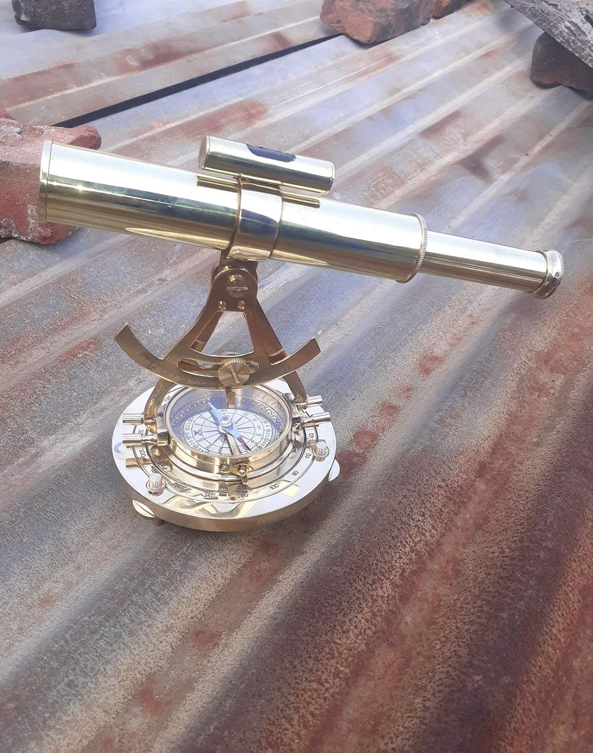 Antique Alidade Brass Telescope with Premium Full Brass Theodolite Compass Alidade Telescope Maritime Desk Collectible 8 Inch Color Golden Full Brass Theodolite Compass Alidade Telescope Maritime Desk Collectible 8 Inch Color Golden Material Used: Solid Brass, Glass Lens, Marble Board For Compass, Premium Brass Finish Color: Golden & Shiny All Work is Hand Made This is a Reproduction Item, Not Antique Good Piece of Collection