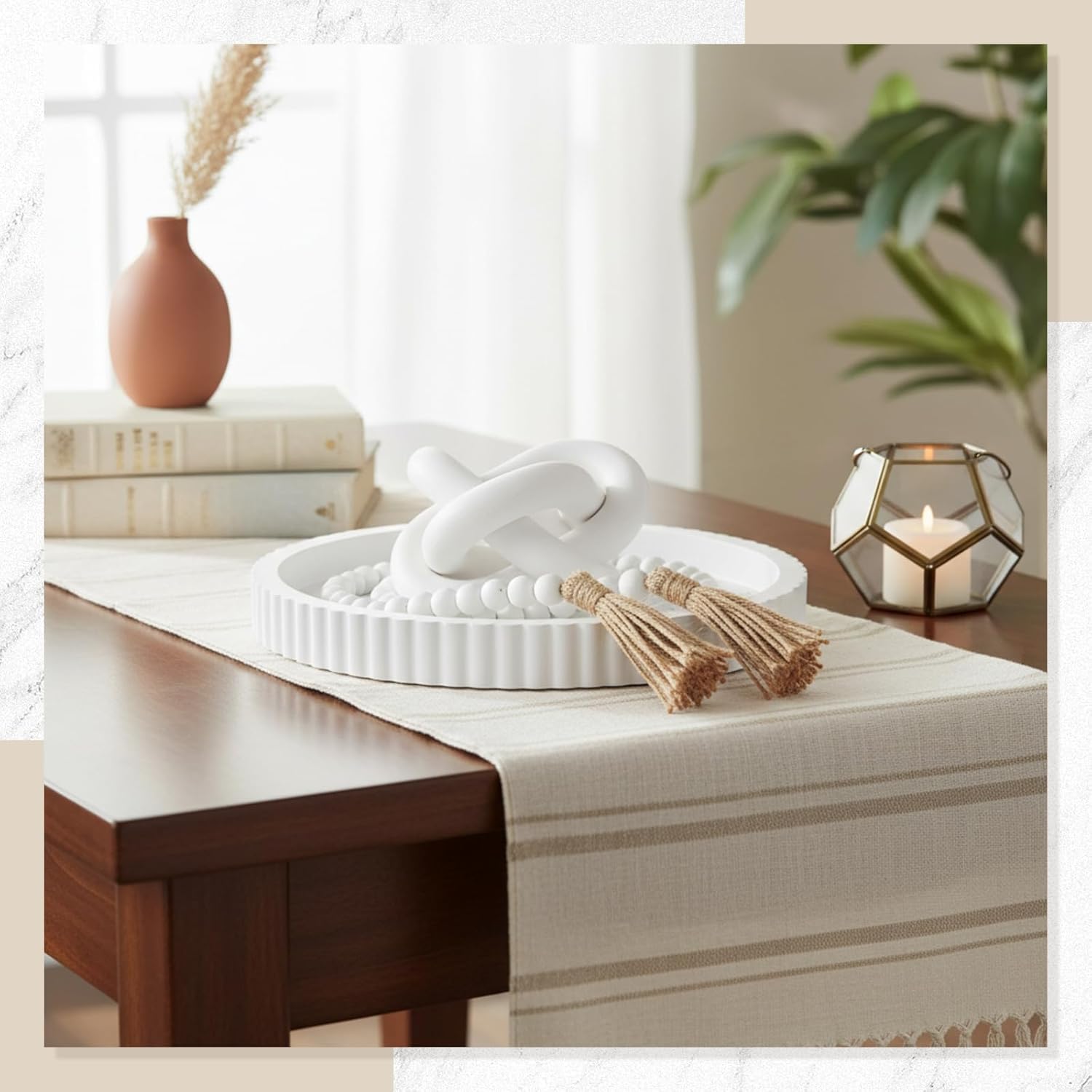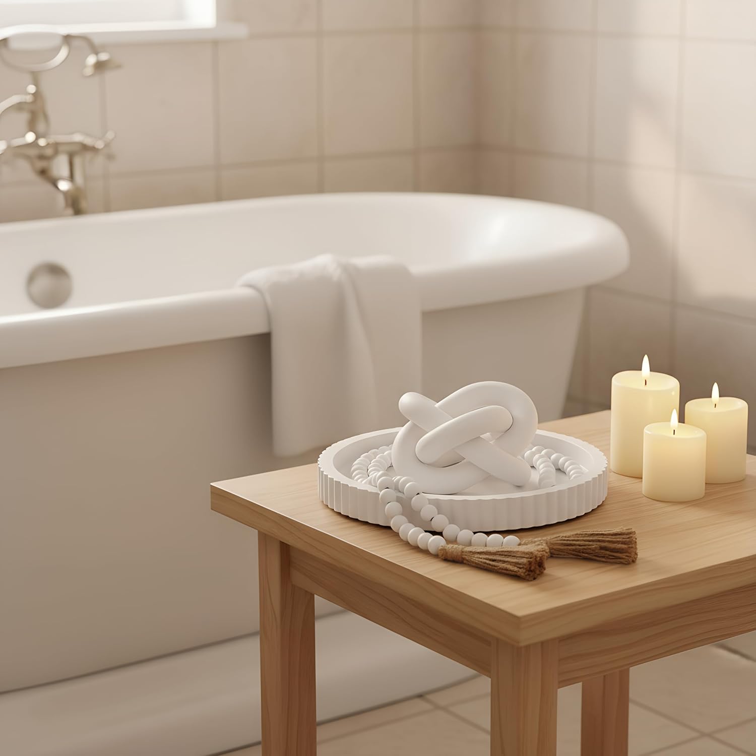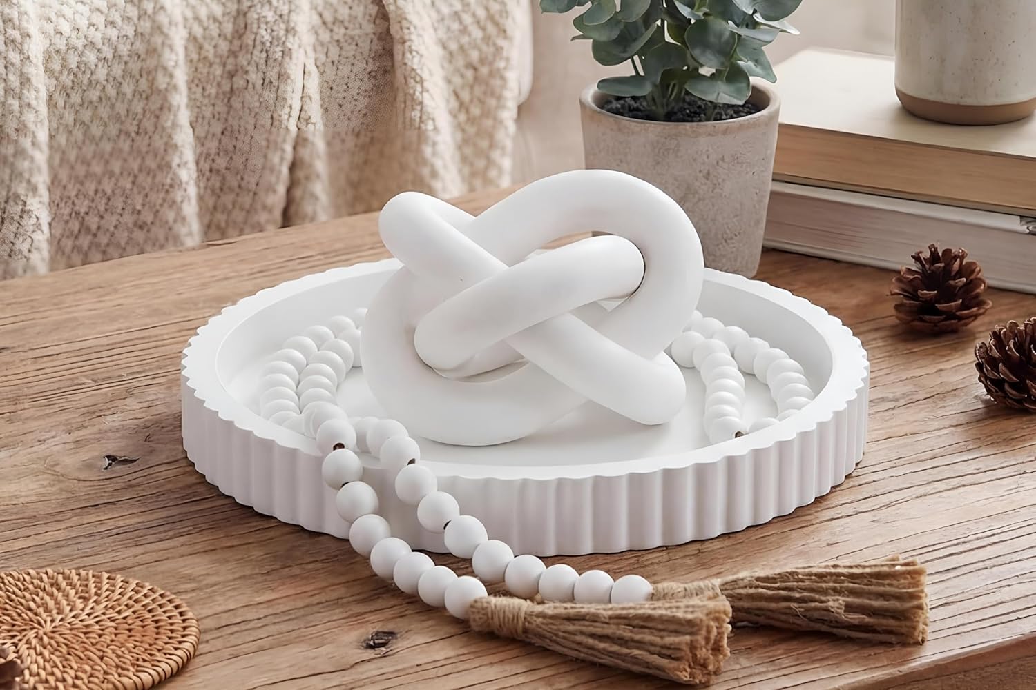 Features: These rustic and farmhouse tray set can be given to family and friends as a moving gift, housewarming, birthday, holiday, Christmas, Thanksgiving and Valentine's Day gift. Also, nice for home bedrooms, kitchens, living rooms, bars and coffee table, bar. The farmhouse serving tray set for tables are designed into round shape, classic and attractive, and decorated with elegant groove, thus making this boho decorative tray full of reliable and rustic feeling, bringing you a sense of comfort. Specifications: Material: wood Color: white Size: The coffee table tray is about 28 x 3 cm/11 x 1.2 inches The farmhouse bead is about 58.27 cm long/22.9 inches The wooden links knots is about 15 x 15 x 15 cm/6 x 6 x 6 inches Package includes: 1 x Farmhouse tray decor 1 x White wooden bead 1 x Boho wood knots Notes: Manual measurement, please allow slight errors on size. The color may exist a slight difference due to different screen displays
