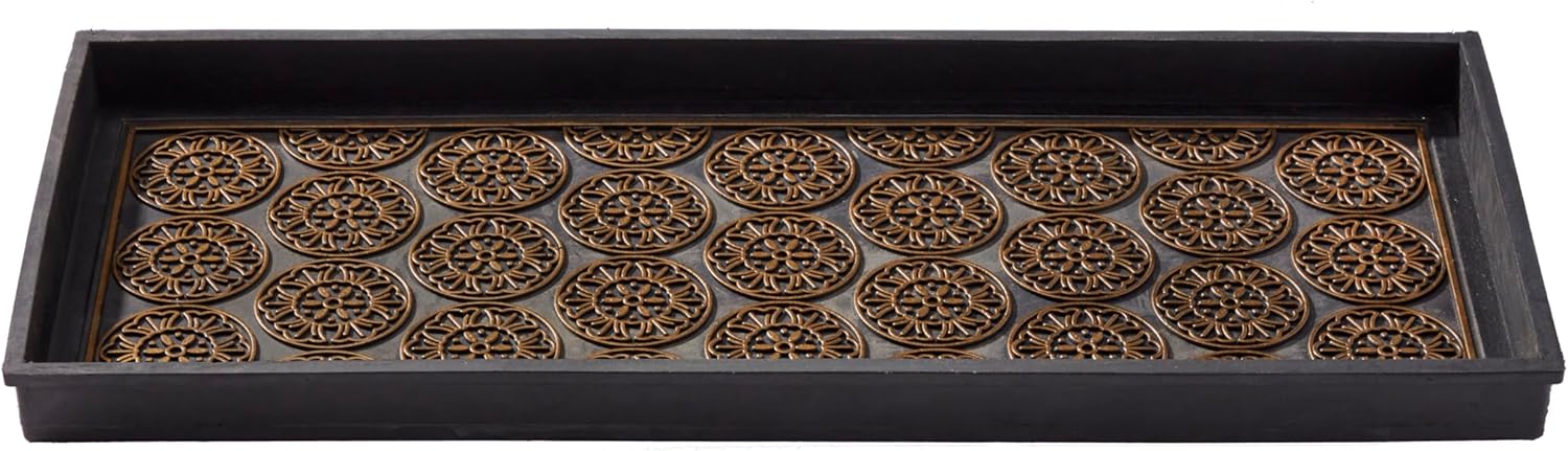 Add style and organization to any doorway, foyer, mud room or laundry room with Home Furnishings by Larry Traverso Boot Trays!The Home Furnishings by Larry Traverso Mandala Premium Rubber Boot Tray is a generously sized tray, measuring 34-inches long by 14-inches wide by 2-inches high, and features an intricate eye-catching design shaped directly into its base. Made of 100% vulcanized rubber, this sturdy tray is durable and long lasting. Ideal for organizing boots, shoes, pet leashes and umbrellas and for keeping mud, debris and clutter off the floor. You can even keep one in your car trunk! The raised pattern is not only an attractive design feature but helps shoes and boots dry faster. Designed to enhance both contemporary and traditional homes, this tray can be used indoors or outdoors and is easy to clean with just a quick rinse of the hose or a damp cloth. Its extra high 2-inch lip and one-piece seamless construction contain any build-up of moisture while ensuring it will not leak, and at 7.5 pounds each, the substantial size and weight keep the tray firmly in place. Impervious to water, mud and snow-melting chemicals, the rubber will not crack or decay over time. An additional piece of molded rubber is added to the base for extra support.Home Furnishings by Larry Traverso specializes in distinct home decor that epitomizes superb individuality. Larry Traverso believes that home decorating should be easy, enjoyable, and affordable. Indulge in stress-free style with Larry Traverso.