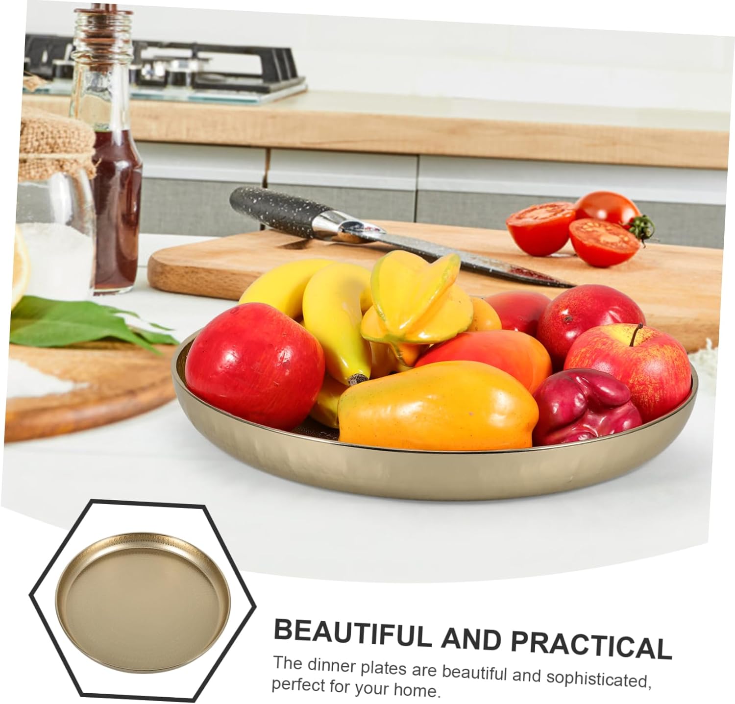 Package List 1 Features -Size:34.00X34.00X3.60cm/13.36X13.36X1.41in snack platter -Product Info:Metal fruit tea tray -Material:Iron round serving platter -Color:Golden serving plates -Round shape of this iron tray allows for easy placement on any surface in kitchen or home platters for serving food party. -Can be used for serving, displaying, and organizing in various ways, meet different using needs. round serving tray -Vintage appearance adds elegance for your home desktop, this tray is very decorative decorative round plate. - The serving tray is made of iron material, so the plate is safe and natural and can be used safely plate. - Versatile and multi-functional design, this is not only a delicate food serving tray, but also a jewelry plate circular serving tray. -The candle tray suitable for placing tealight candle, candle cup, flameless candle, etc round tray for desk.Goods Descriptionsnack serving tray Its multi-purpose design allows you to use it in different ways, whether it's for serving drinks and snacks, displaying candles or other decorative items.round trays This round tray is not only a decorative piece but also functional