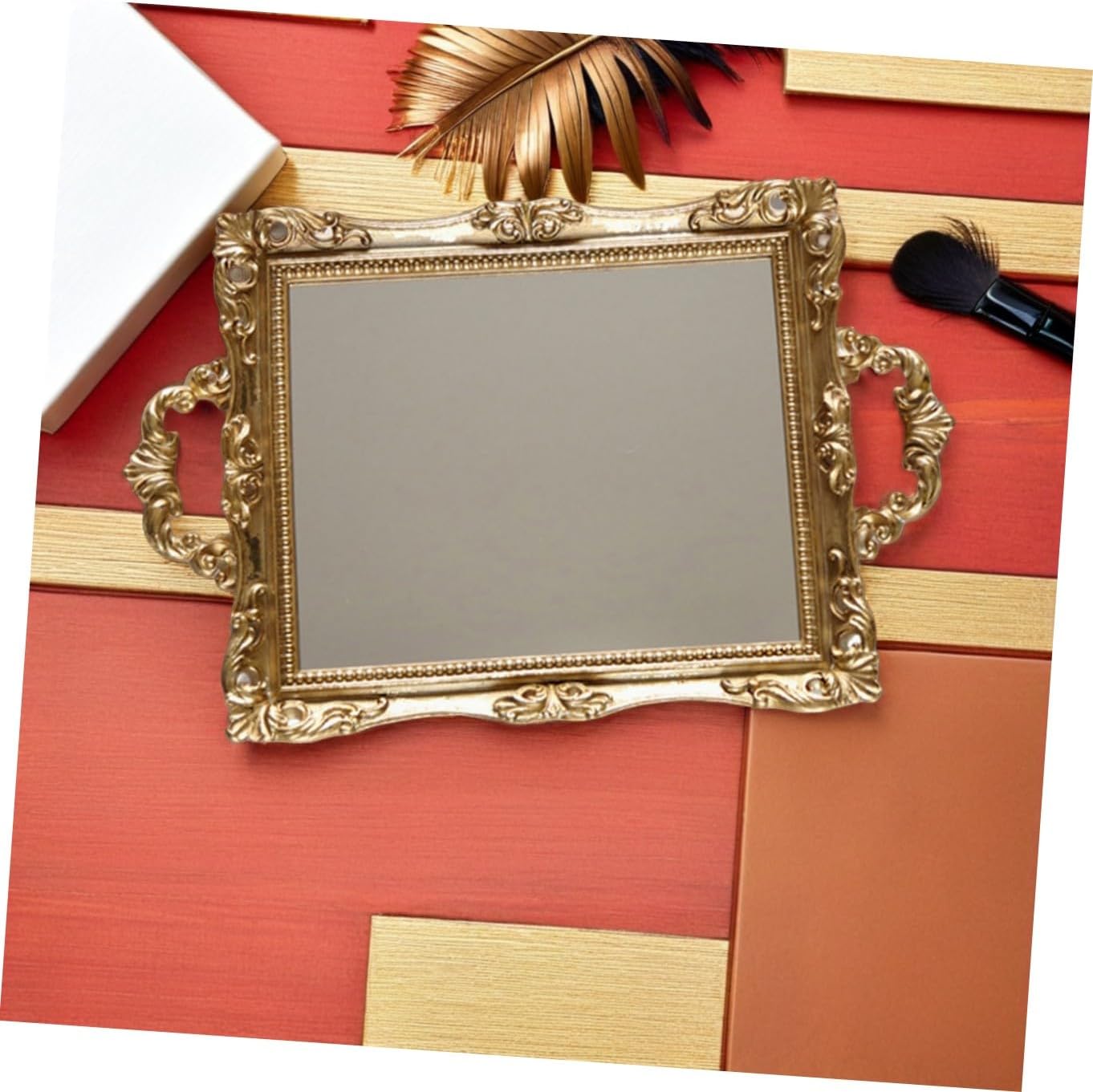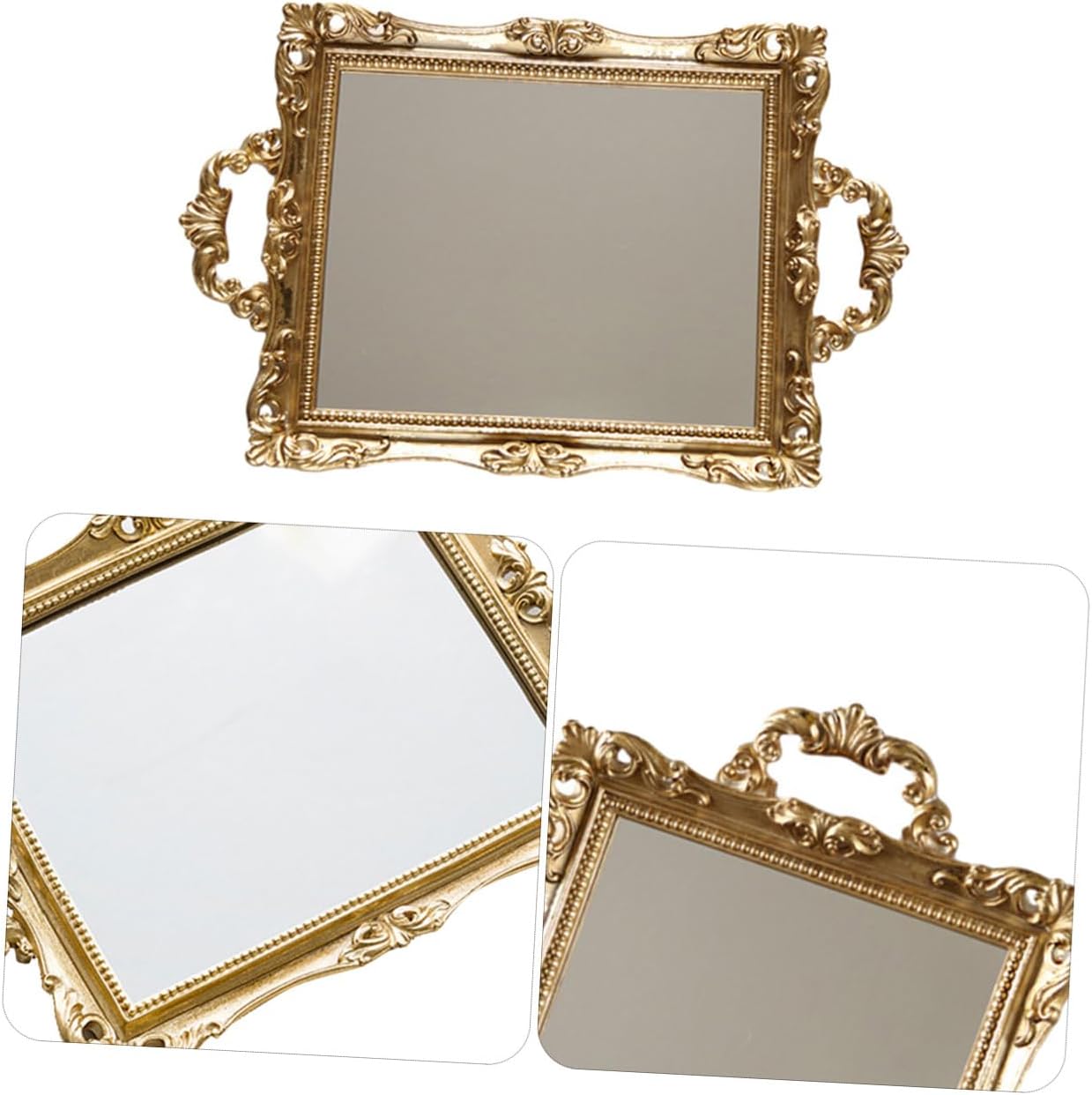 Package List 1 Features - Material: resin and glass mirror. - Color: golden. - Size: About 36.80X23.00X5.00cm/14.49X9.06X1.97inch. -Product Info:Mirror tray - Fine workmanship, polished smooth, elegant and delicate look, very practical mirror table tray. - Whether as a photo prop or home furnishing are very appropriate decor mirror tray. - resin and glass mirror material, safe and also decorative for you to use. - Can be used for wedding dessert table decor, delicate and beautiful mirror serving tray. - The retro carved Nordic style decorative storage mirror tray, very textured ornate tray.Goods Descriptionmirror serving tray Are you still looking for an and multi-purpose storage mirror tray? Our product can meet your needs.dressing table tray vintage It is widely used for dining table, kitchen, toilet and other places.ornate tray Very fashionable and chic, with the design of Nordic style retro carved pattern design