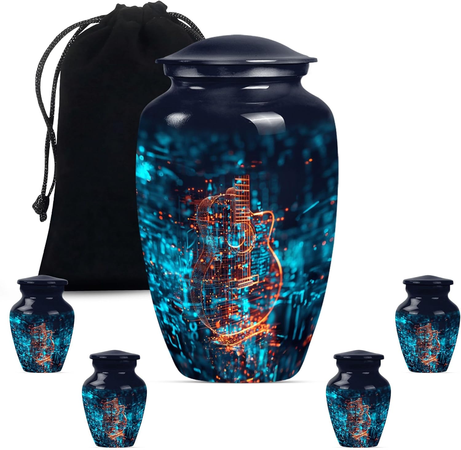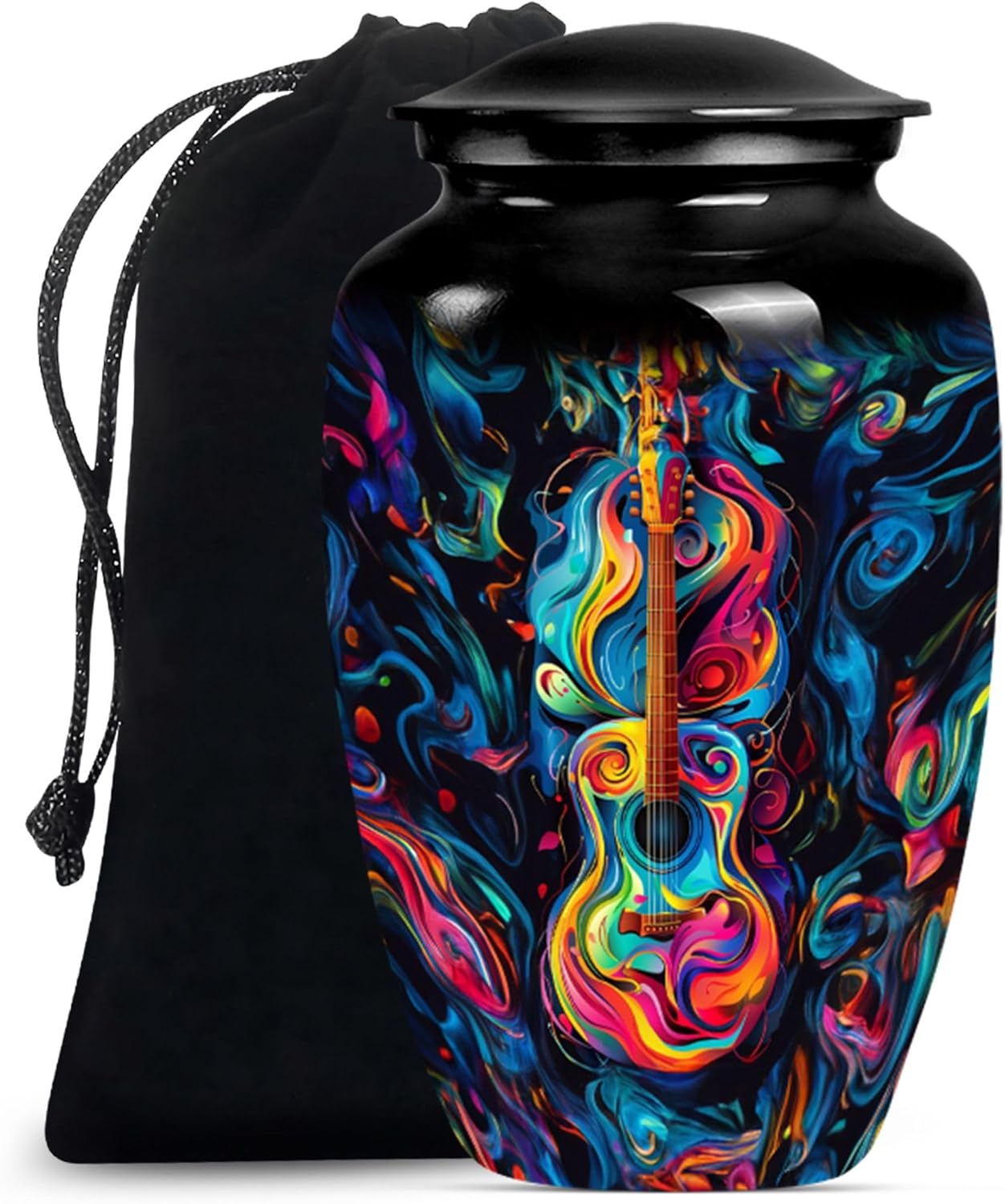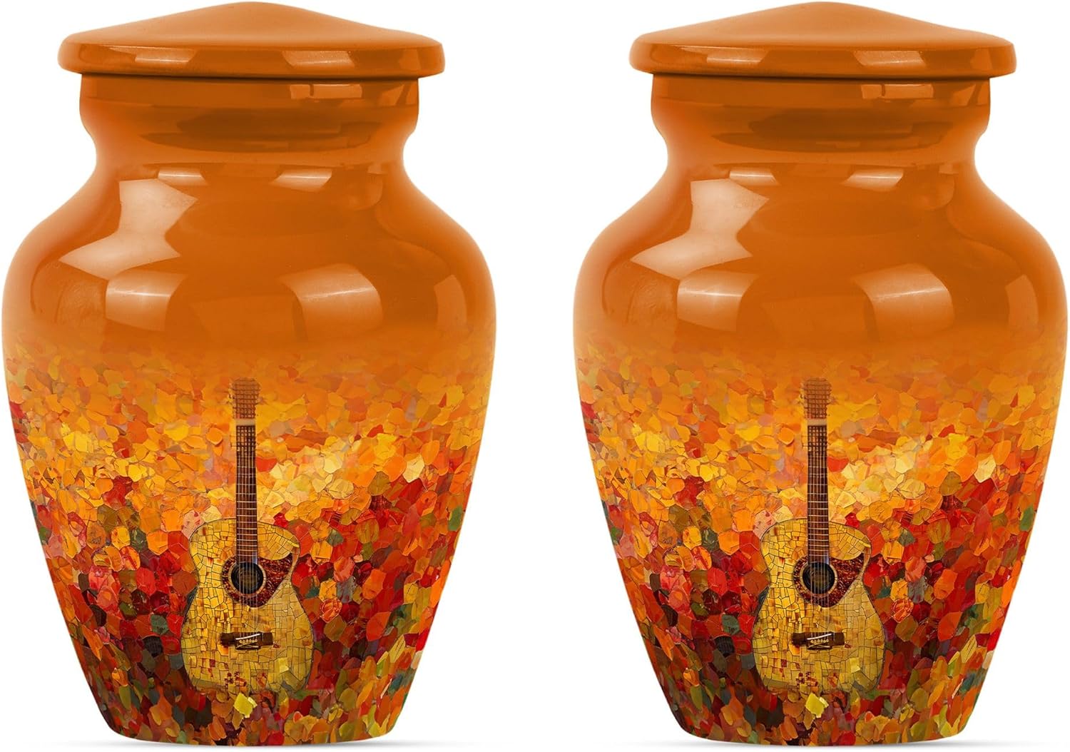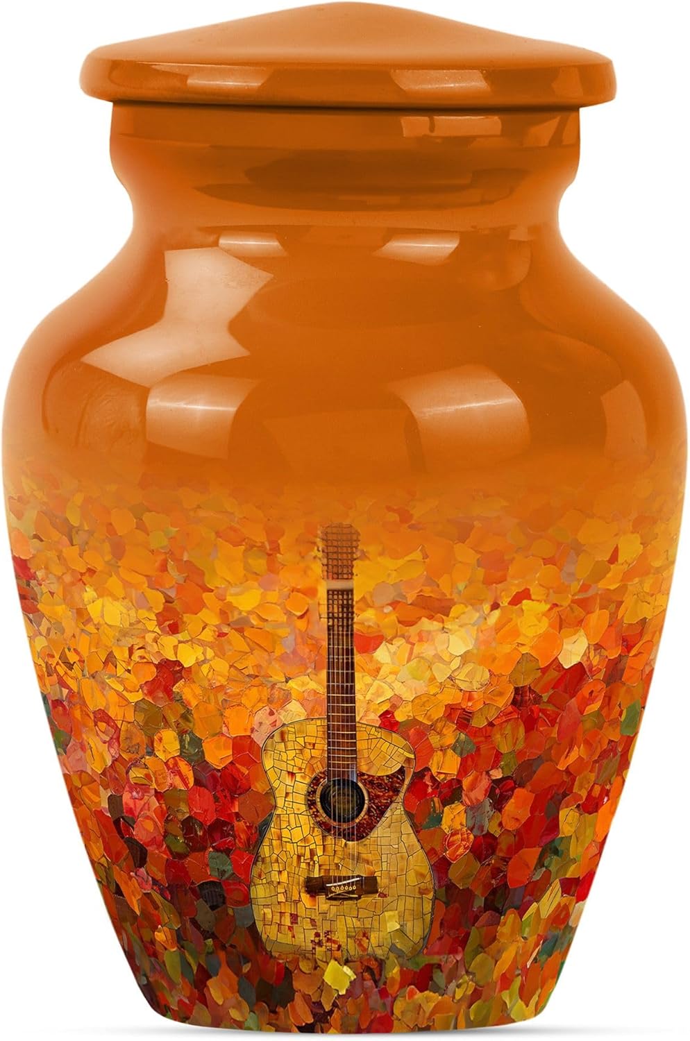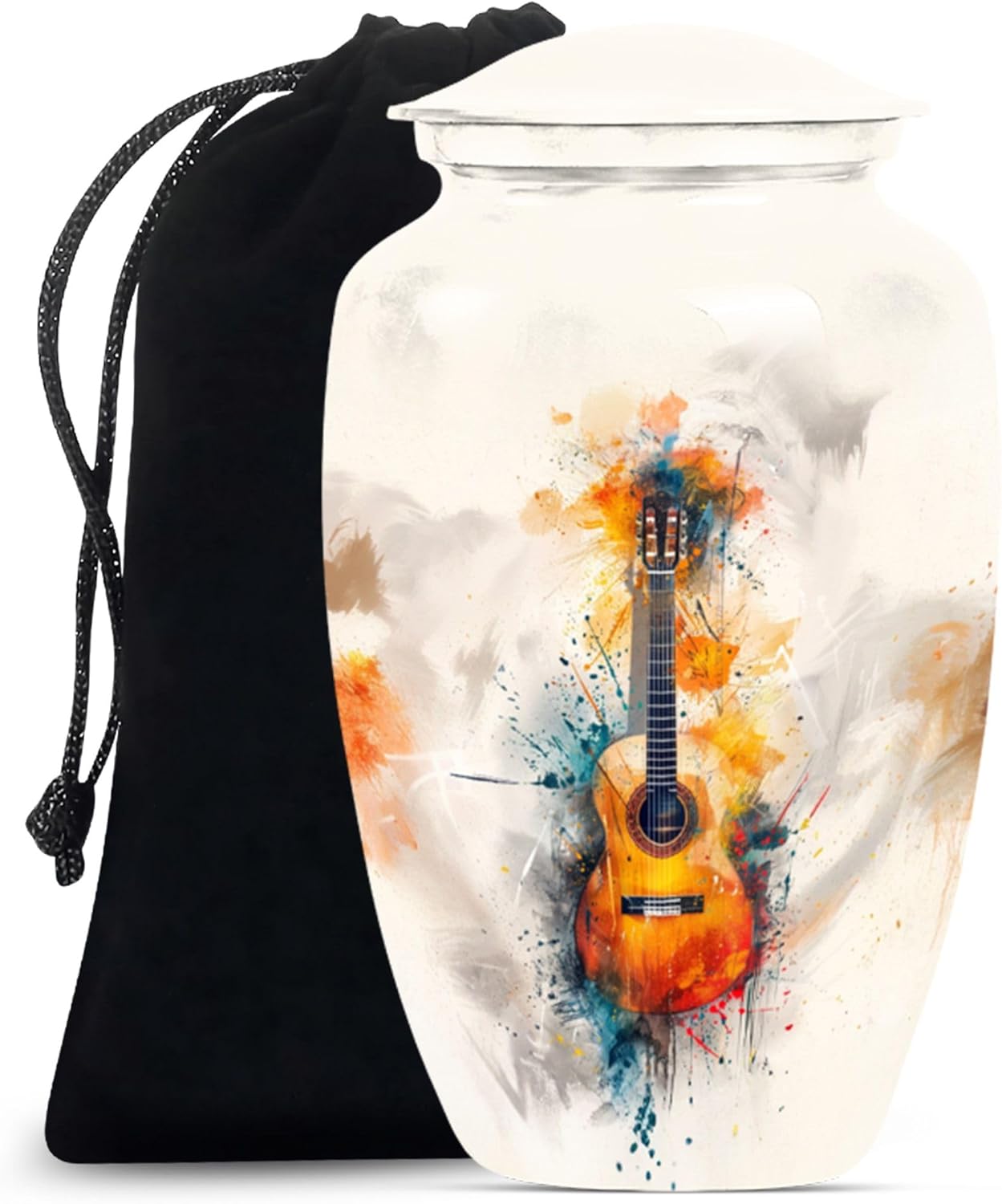 GUITAR FOR HUMAN ASHES/ MINI KEEPSAKE URN Urns serve as a timeless tribute to loved ones, reflecting the unique lives they lived.Our collection offers a diverse range of urns, available in various sizes and shapes to suit different preferences and needs. We are particularly proud of our meticulously crafted selection, which includes keepsake urns measuring 3 inches, perfect for holding a small, personal remembrance.These keepsake urns come in convenient options, either as a single pack or in a pack of four, allowing families to share and cherish these memories. For those seeking a more traditional size, we offer large urns at 10 inches, which can accommodate a full set of ashes.Every urn in our collection is designed with care and attention to detail, ensuring that each piece is not only a receptacle for ashes but also a beautiful work of art. Our urns come in multiple designs, each with its own distinctive style, ensuring that you can find the perfect expression of love and remembrance for your beloved. We take great pride in offering these choices, helping you honor your loved one's memory in the most fitting way.